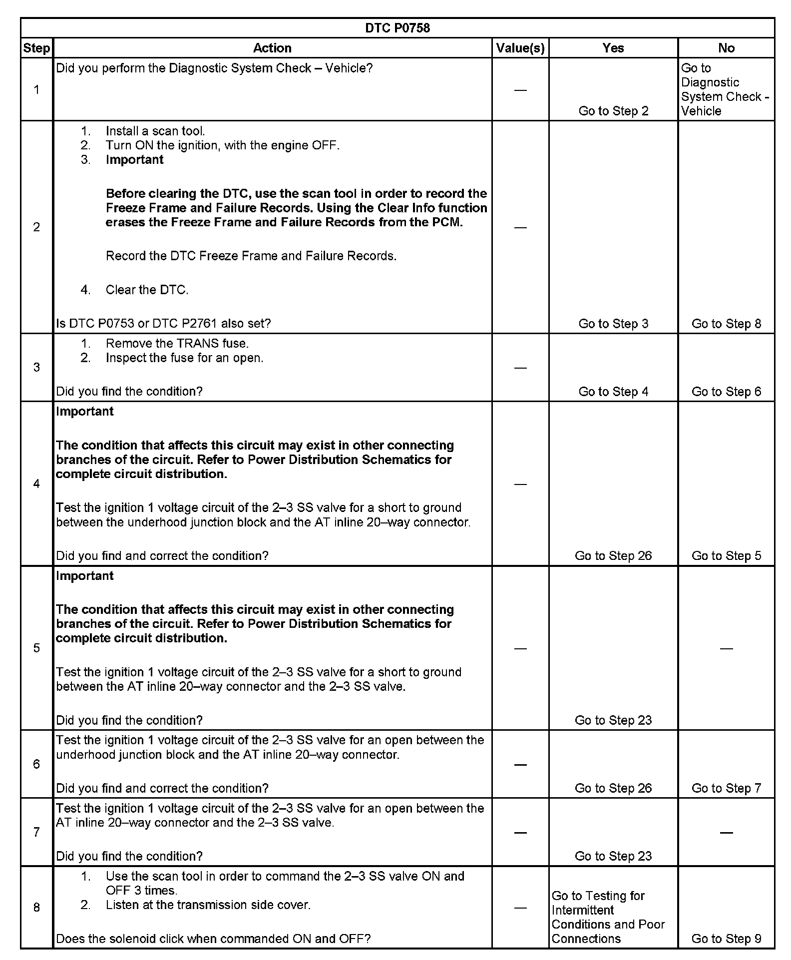 When the PCM detects a continuous open, short to ground, or short to voltage in the 2-3 SS valve circuit, then DTC P0758 sets. DTC P0758 is a type A DTC.