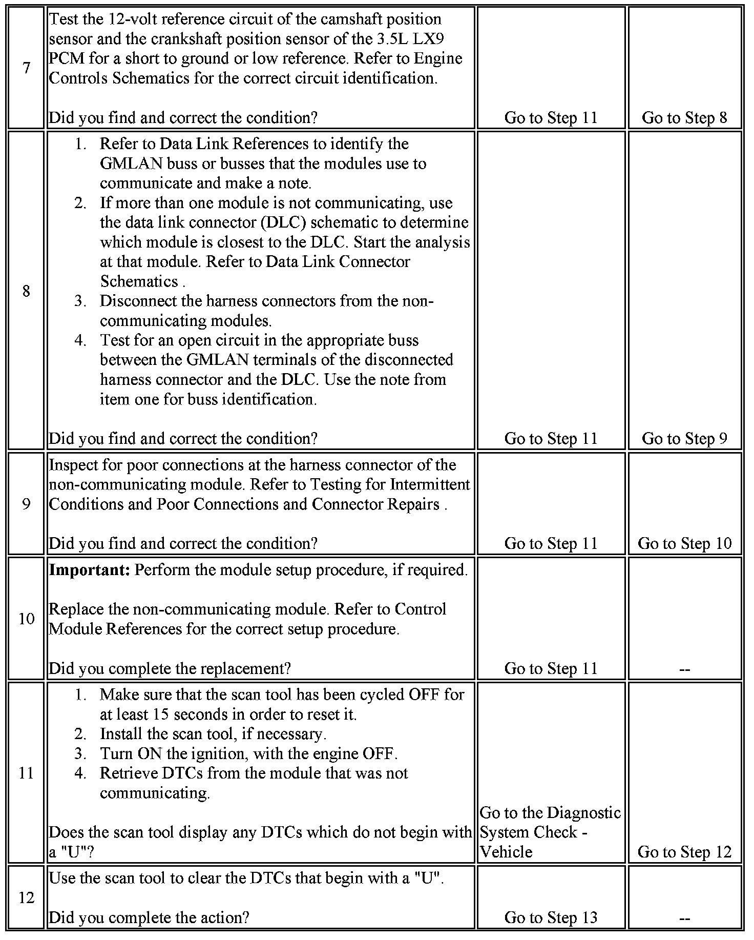 7. The powertrain control module (PCM) that is used in the 3.5L (LX9) powertrain package can lose communication with the buss if there is a malfunction in the camshaft position (CMP) or the crankshaft position (CKP) sensors 12-volt reference circuit.
