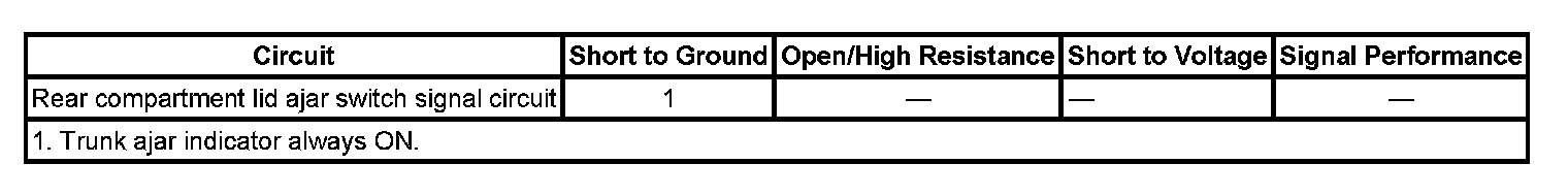 2. With the ignition ON and the rear compartment lid closed, verify the status of the rear compartment lid ajar indicator.If the rear compartment indicator is not illuminated, replace the ajar switch. If the rear compartment lid ajar indicator is still illuminated, test the rear compartment lid ajar switch signal circuit for a short to ground.