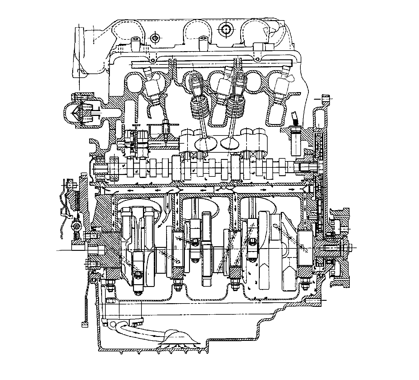 The hydraulic lifters pump oil up through the pushrods to the rocker arms. The cast dams in the crankcase casting direct the oil that drains back from the rocker arms in order to supply the camshaft lobes. The camshaft chain drive is lubricated by indirect oil splash.