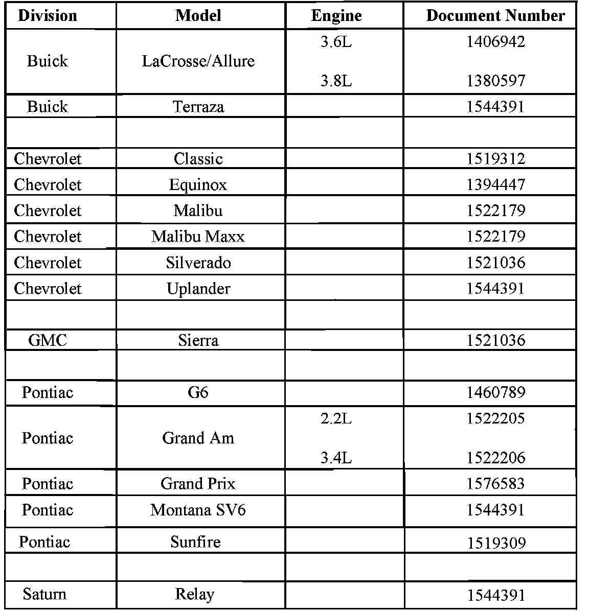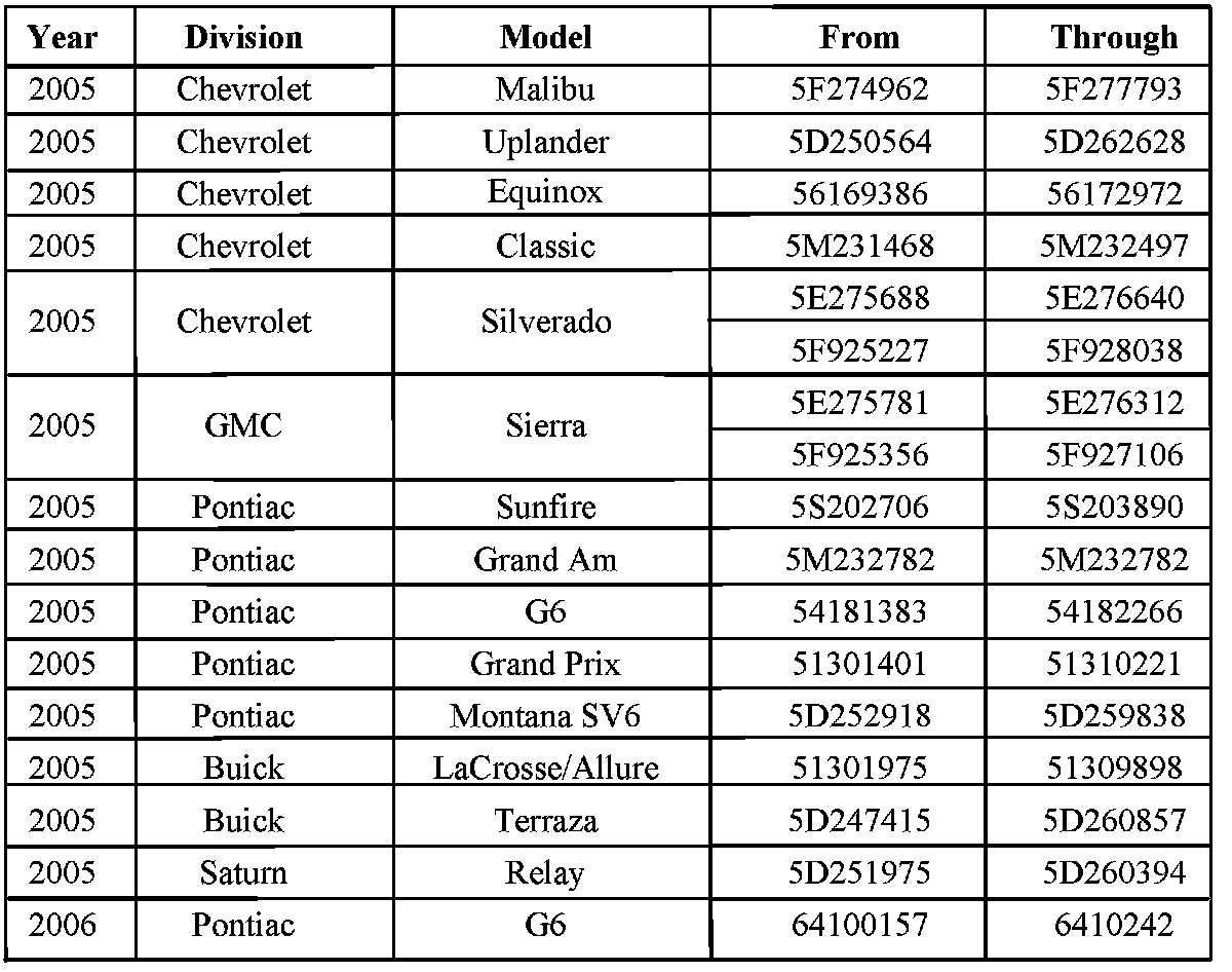 Involved are certain 2005 Chevrolet Malibu, Uplander, Equinox, Classic, Silverado; GMC Sierra; Pontiac Sunfire, Grand Am, G6, Grand Prix, Montana SV6; Buick LaCrosse/Allure, Terraza; Saturn Relay; and 2006 Pontiac G6 model vehicles and built within the VIN breakpoints shown.