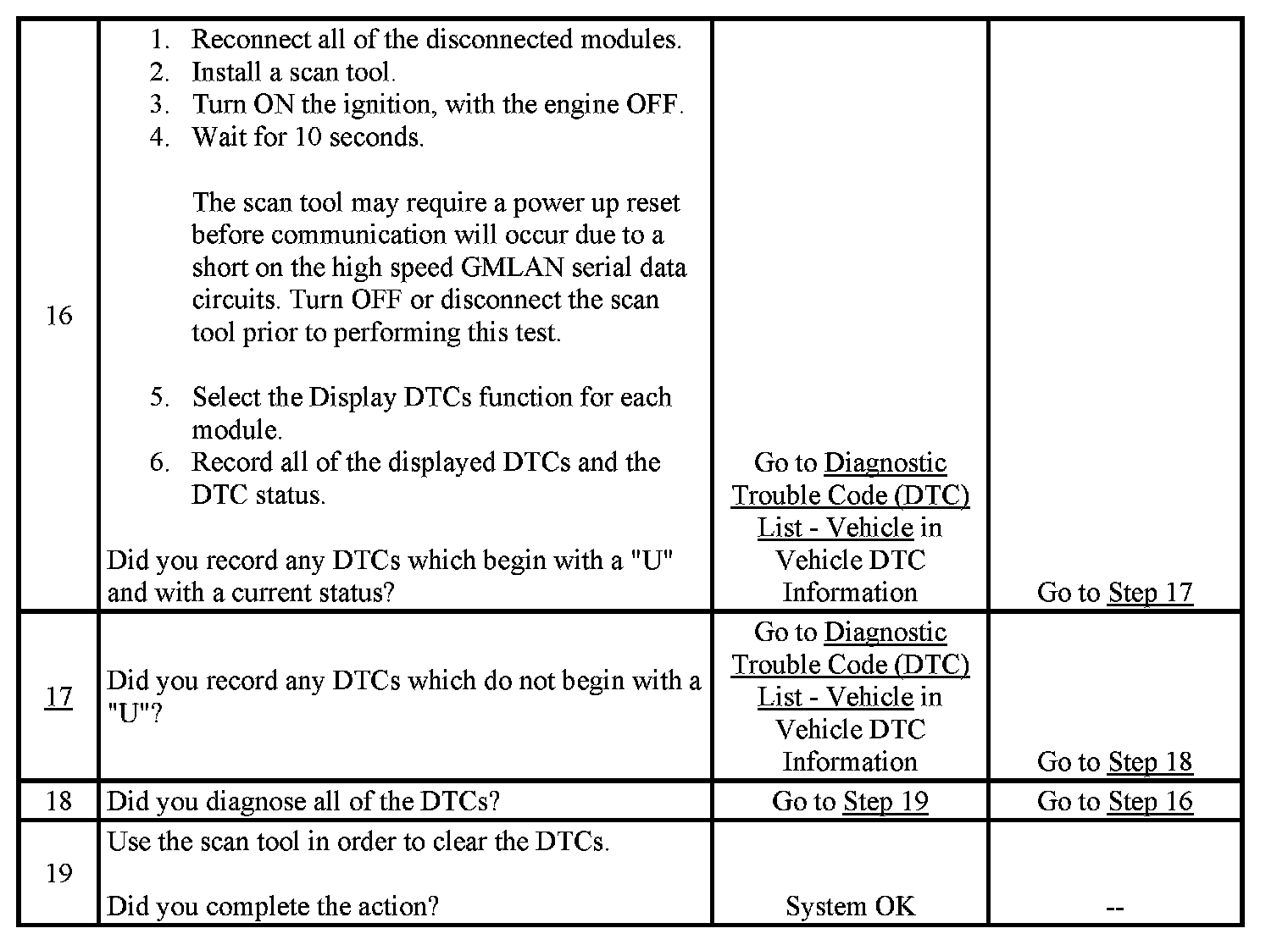 Modules connected to the high speed GMLAN serial data circuits monitor for serial data communications on the high speed GMLAN network during normal vehicle operation. Operating information and commands are exchanged among the modules. When a module detects a bus-off condition a DTC U0001 or U2100 will be set. These DTCs can be retrieved as history only.