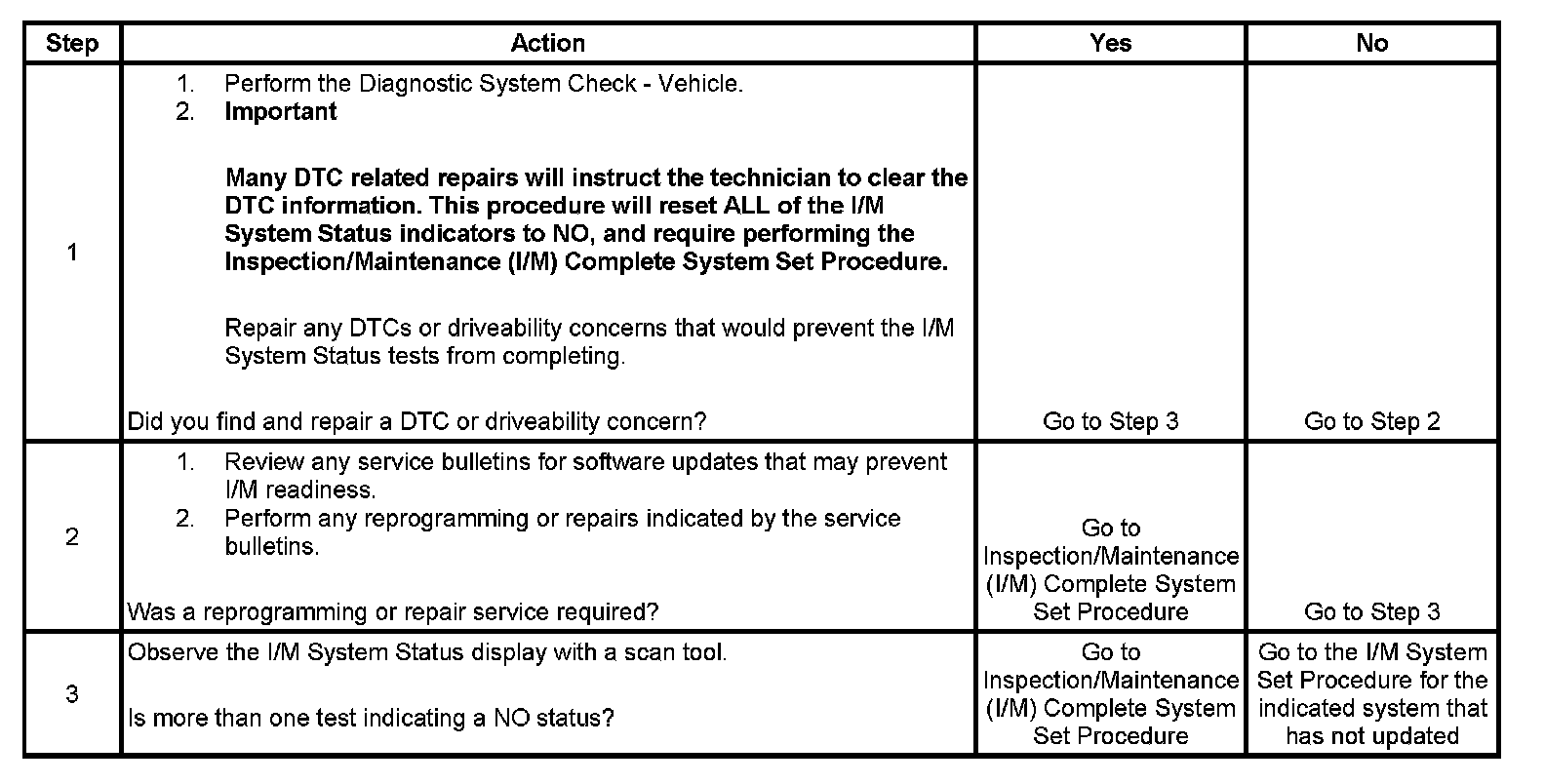 For example, when the HO2S Heater Status indicates YES, either all of the oxygen sensor heater tests have passed or one of the tests has illuminated the MIL. If the vehicle has four heated oxygen sensors, either all four heater circuit tests have passed or one of the heater circuit tests has illuminated the MIL. The I/M System Status will indicate NO under the Completed column when any of the required tests for that system have not run. The following is a list of conditions that would set the I/M System Status indicator to NO: