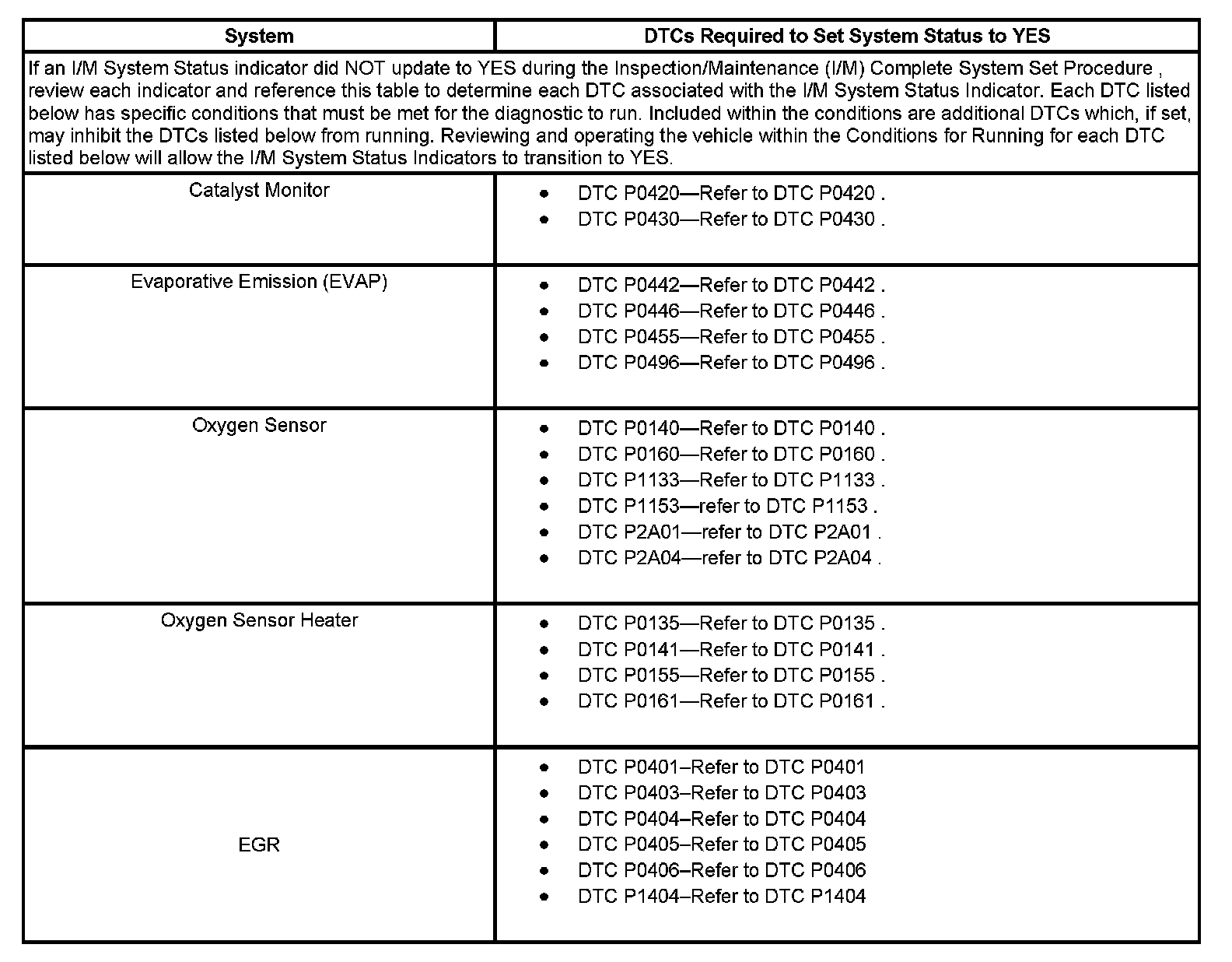 Inspection/Maintenance (I/M) System DTC Table: