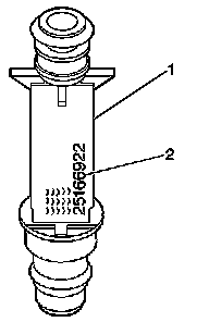 1. The fuel injector assembly (1) is stamped with a part number identification (2).