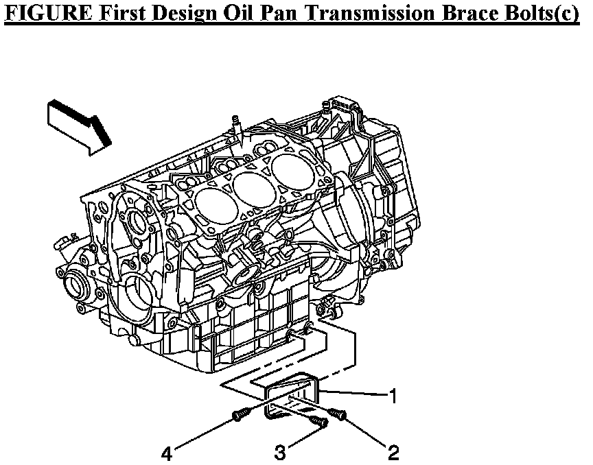 - If the vehicle is equipped with first design oil pan transmission brace, refer to first design illustration and perform steps 11-14.