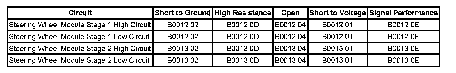 DTC B0012 0E Stage 1 or B0013 0E Stage 2 will set if the steering wheel module coil was serviced and the connector position assurance (CPA) is not inserted completely into the connector on the back side of steering wheel module coil.