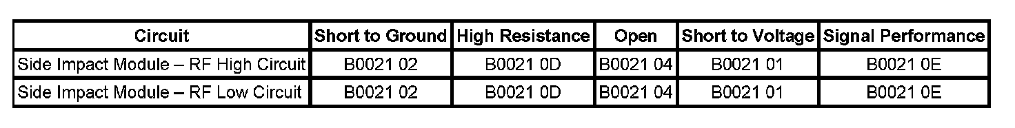 - Test and repair both side impact module - RF high and low circuits for a short to voltage, short to ground, or open/low resistance. If all circuits test normal then replace the SDM.