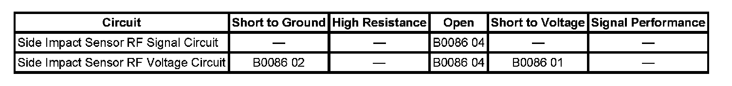 The inflatable restraint side impact sensor (SIS) utilizes a unidirectional 2-wire circuit. The SIS modulates current on the interface to send ID, State of Health, and deployment commands to the inflatable restraint sensing and diagnostic module (SDM). The SDM serves as a power source and a ground for the SIS. When the ignition is turned ON and input power from the SDM is first detected, the SIS responds by performing internal diagnostics and sending an ID to the SDM. The SDM considers the ID to be valid if the response time is less than 5 seconds. The SIS continually communicates status messages to the SDM, which determines if a fault is present in the SIS circuit. When a fault is detected, the SDM resets the SIS twice by removing and reapplying power to it. If the fault is still present, the SDM will set a DTC.
