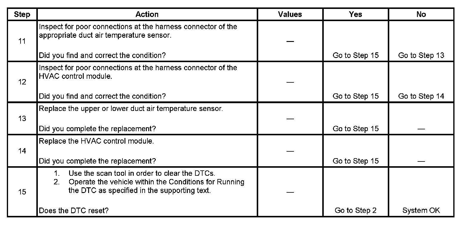 If the DTC sets due to the low condition, the HVAC control module will default to maximum cooling, except when the maximum heating setting is selected. If the DTC sets due to the high condition, the HVAC control module will default to maximum heating, except when the maximum cooling setting is selected.