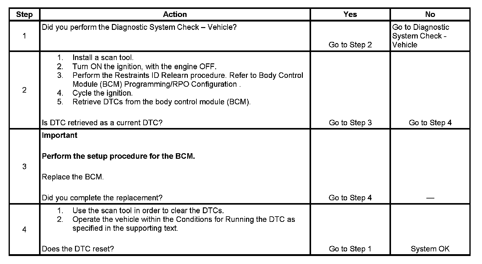 The body control module (BCM) stores the last 4 digits of the sensing and diagnostic module (SDM) part number, information also called restraints ID. After the BCM is reprogrammed, the restraints ID is set to zero. A restraints ID relearn needs to be performed for the BCM. For more information on this procedure, refer to Body Control Module (BCM) Programming/RPO Configuration.