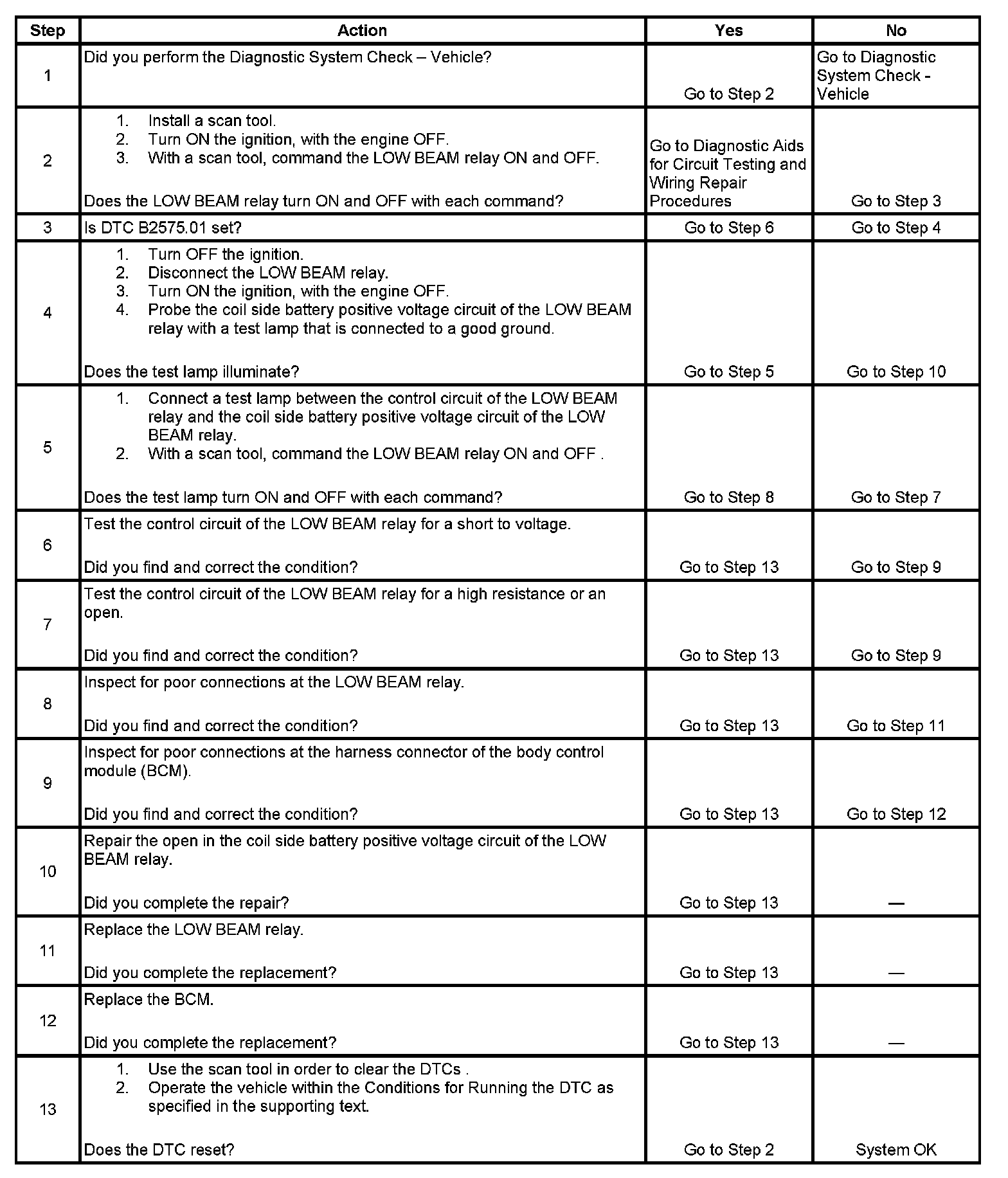 - B2575.06 will set if there is an open or short to ground in the low beam relay control circuit.