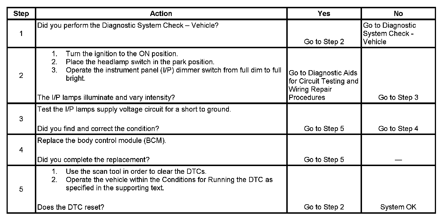 - The BCM detects a short to ground in the instrument panel lamp supply voltage circuit.