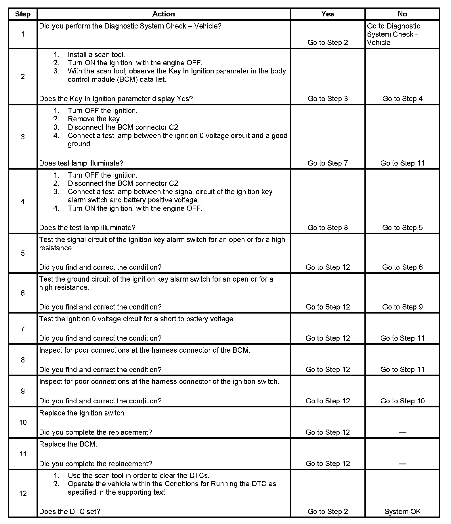 The body control module (BCM) monitors the ignition key alarm switch. When the key is in the ignition, the ignition key alarm switch is closed and the signal circuit is low. When the key is not in the ignition, the ignition key alarm switch is open and the signal circuit is high.