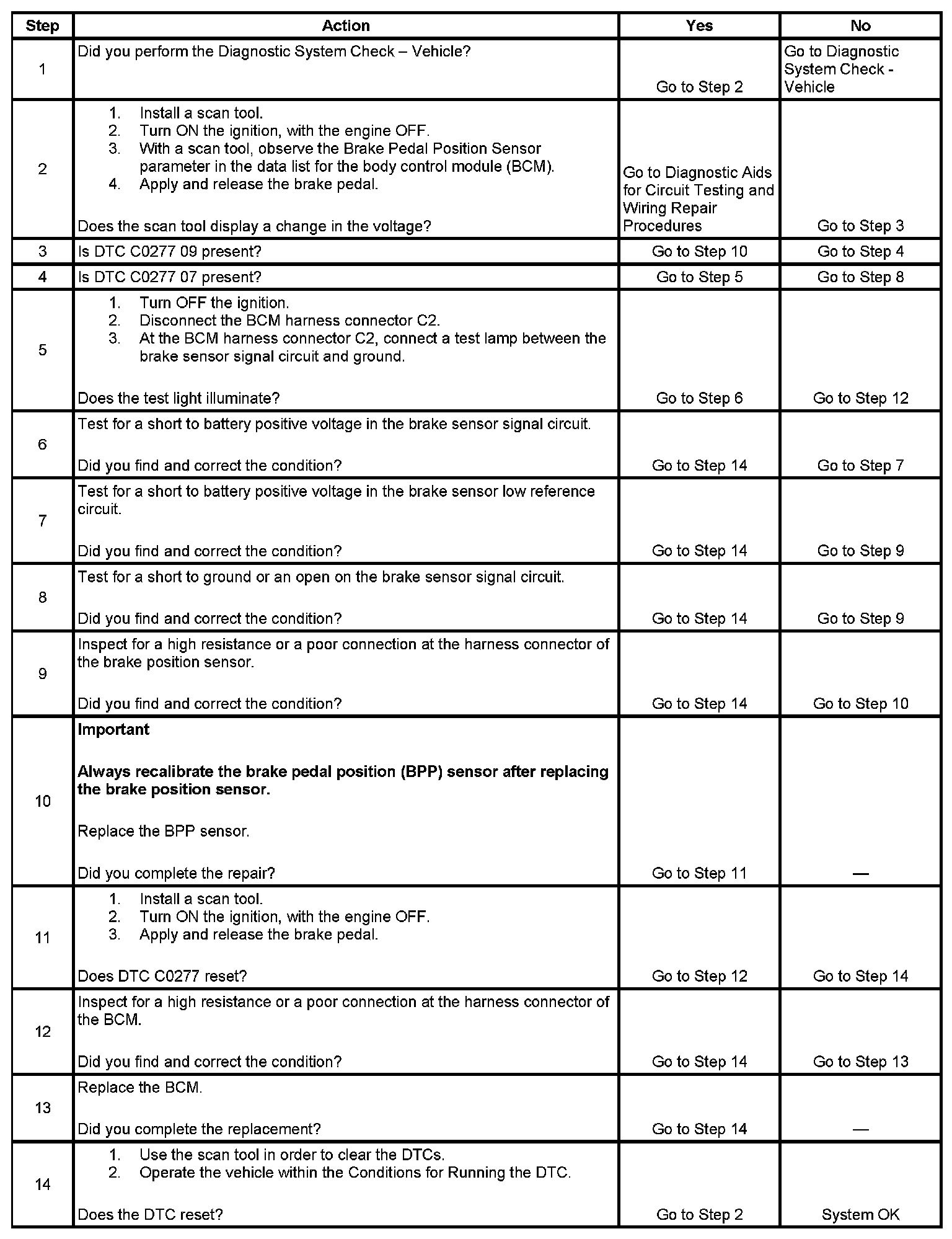 - If DTC C0277 09 is set, replace the BPP sensor. If the DTC resets, replace the BCM.