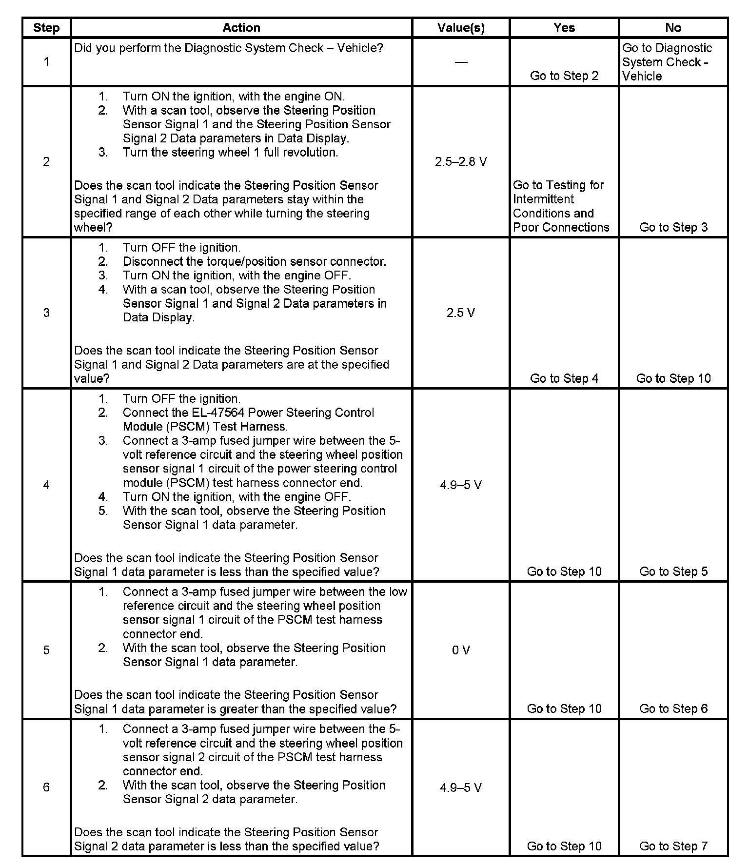 The steering wheel position sensor is a 5-volt dual analog triangle signal device which is used to sense the steering system's center position to provide equal return to center and on center feel. The valid signal voltage range of the sensor is 0-5 volts. The sensor's 2 signal voltages will increase and decrease within the valid signal voltage range and stay within a voltage range of each other as the steering wheel is turned.