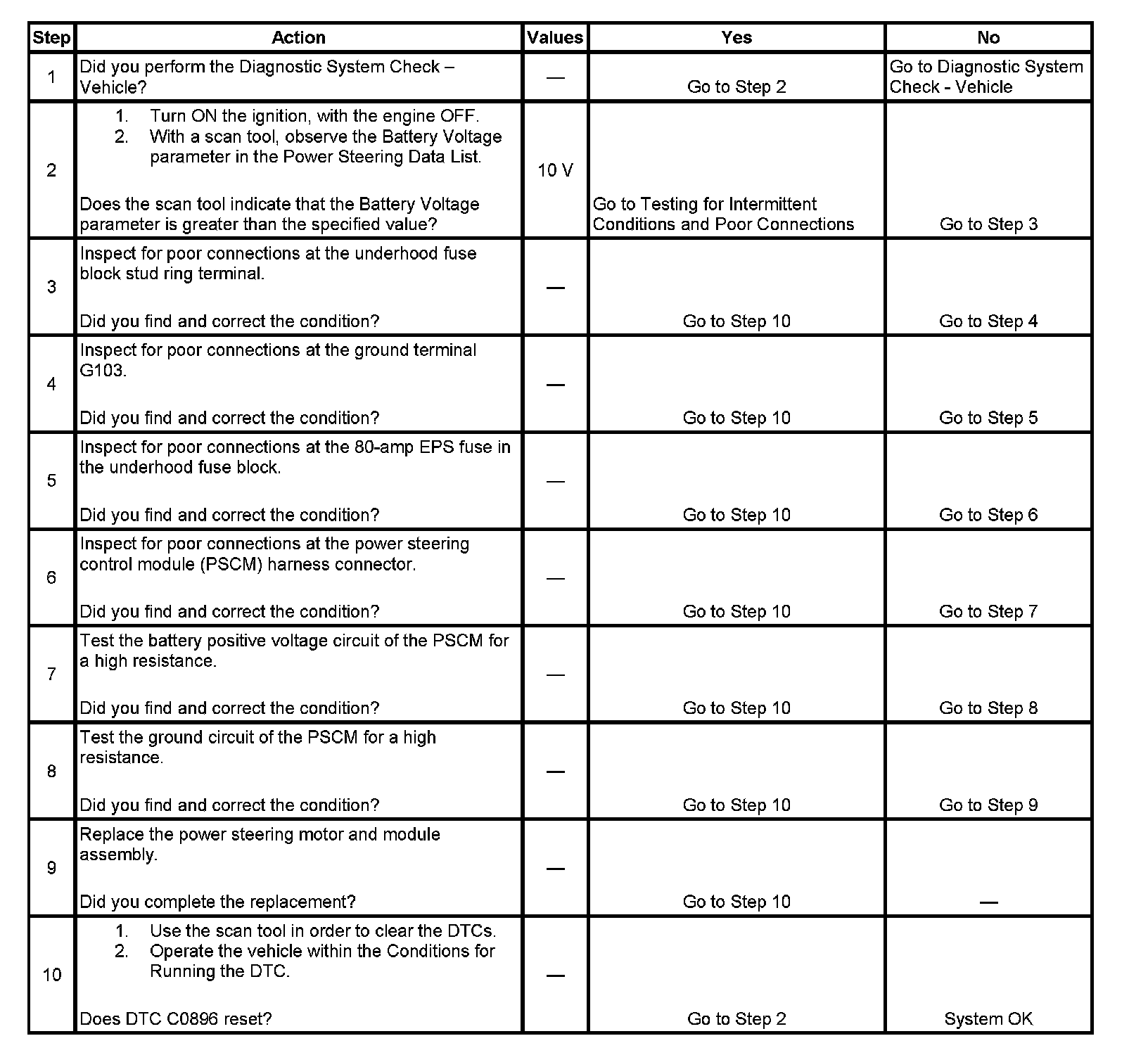 ^ A history DTC will clear after 100 consecutive ignition cycles with the power steering system voltage greater than 10 volts.