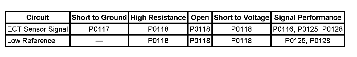 The engine coolant temperature (ECT) sensor is a variable resistor, that measures the temperature of the engine coolant. The control module supplies 5 volts to the ECT signal circuit and a ground for the ECT low reference circuit. When the ECT is cold, the sensor resistance is high. When the ECT increases, the sensor resistance decreases. With high sensor resistance, the control module detects a high voltage on the ECT signal circuit. With lower sensor resistance, the control module detects a lower voltage on the ECT signal circuit. If the control module detects an excessively low ECT signal voltage, which is a high temperature indication, DTC P0117 sets. If the control module detects an excessively high ECT signal voltage, which is a low temperature indication, DTC P0118 sets.