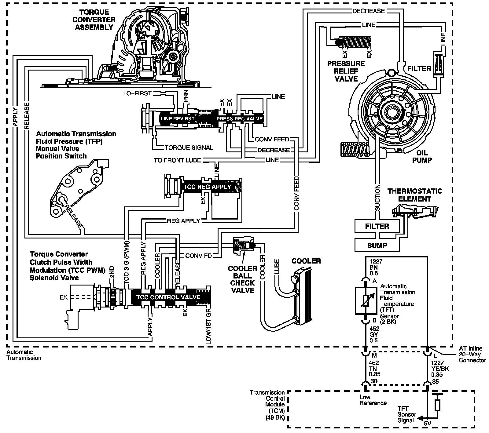 Hot fluid from the torque converter flows through the torque converter clutch (TCC) control valve into the cooler lines to the oil cooler located in the vehicle radiator and auxiliary cooler, if equipped. Cool fluid then returns to lubricate the final drive assembly and other components along the output shaft.