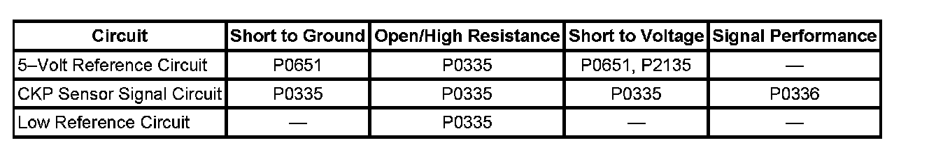 - The ECM detects that the starter is commanded on and the engine has been cranking for more than 4 seconds without a CKP sensor pulse. OR