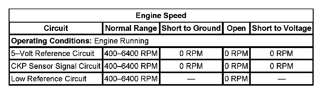 The crankshaft position (CKP) sensor circuits consist of an engine control module (ECM) supplied 5-Volt reference circuit, low reference circuit and an output signal circuit. The CKP sensor is an internally magnetic biased digital output integrated circuit sensing device. The sensor detects magnetic flux changes of the teeth and slots of a 58-tooth reluctor wheel on the crankshaft. Each tooth on the reluctor wheel is spaced at 60-tooth spacing, with 2 missing teeth for the reference gap. The CKP sensor produces an ON/OFF DC voltage of varying frequency, with 58 output pulses per crankshaft revolution. The frequency of the CKP sensor output depends on the velocity of the crankshaft. The CKP sensor sends a digital signal, which represents an image of the crankshaft reluctor wheel, to the ECM as each tooth on the wheel rotates past the CKP sensor. The ECM uses each CKP signal pulse to determine crankshaft speed and decodes the crankshaft reluctor wheel reference gap to identify crankshaft position. This information is then used to determine the optimum ignition and injection points of the engine. The ECM also uses CKP sensor output information to determine the camshaft relative position to the crankshaft, to control camshaft phasing, and to detect cylinder misfire.