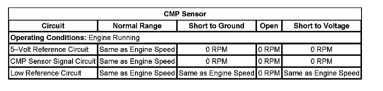 1. With the engine running, observe the CMP Sensor parameter using the scan tool. The CMP Sensor speed should match the Engine Speed parameter within 100 RPM.
