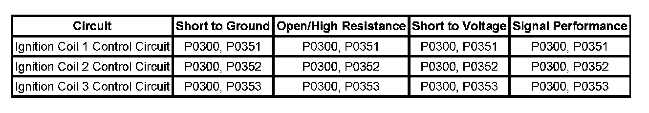 The engine control module (ECM) controls each ignition coil by transmitting timing pulses to the ICM on each of the ignition coil control circuits to enable properly timed spark events. The ignition coil 1 controls spark for companion cylinders 1 and 4. The ignition coil 2 controls spark for companion cylinders 2 and 5. The ignition coil 3 controls spark for companion cylinders 3 and 6.