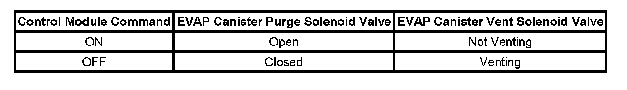 The control module tests the evaporative emission (EVAP) system for a large leak. The control module monitors the fuel tank pressure (FTP) sensor signal to determine the EVAP system vacuum level. When the conditions for running are met, the control module commands the EVAP canister purge solenoid valve OPEN and the EVAP vent solenoid valve CLOSED. This allows engine vacuum to enter the EVAP system. At a calibrated time, or vacuum level, the control module commands the EVAP canister purge solenoid valve closed, sealing the system, and monitors the FTP sensor input in order to determine the EVAP system vacuum level. The table illustrates the relationship between the ON and OFF states, and the OPEN or CLOSED states of the EVAP canister purge and vent solenoid valves.