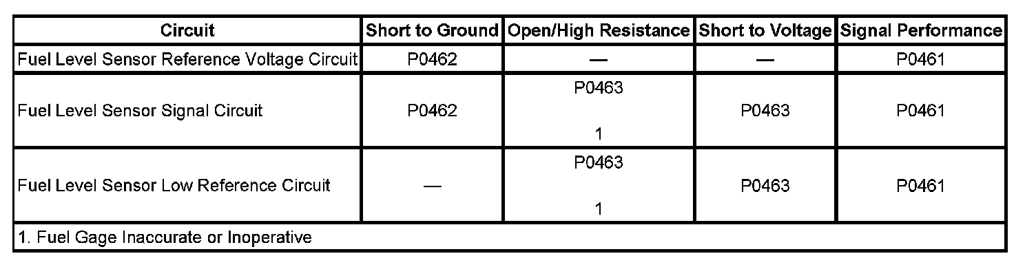 The fuel level sensor changes resistance in response to the fuel level. The powertrain control module (PCM) or the engine control module (ECM) monitors the signal circuit of the fuel level sensor in order to determine the fuel level. When the fuel tank is full, the sensor resistance is low and the PCM/ECM senses a low signal voltage. When the fuel tank is empty, the sensor resistance is high and the PCM/ECM senses a high signal voltage. The PCM/ECM uses the signal circuit of the fuel level sensor in order to calculate the percentage of remaining fuel in the tank. The PCM/ECM sends the fuel level percentage via GMLAN serial data circuit to the body control module (BCM). The BCM sends a GMLAN message to the instrument panel cluster (IPC) in order to display the fuel level percent on the fuel gage. The fuel information is also used for misfire and evaporative emission (EVAP) diagnostics.