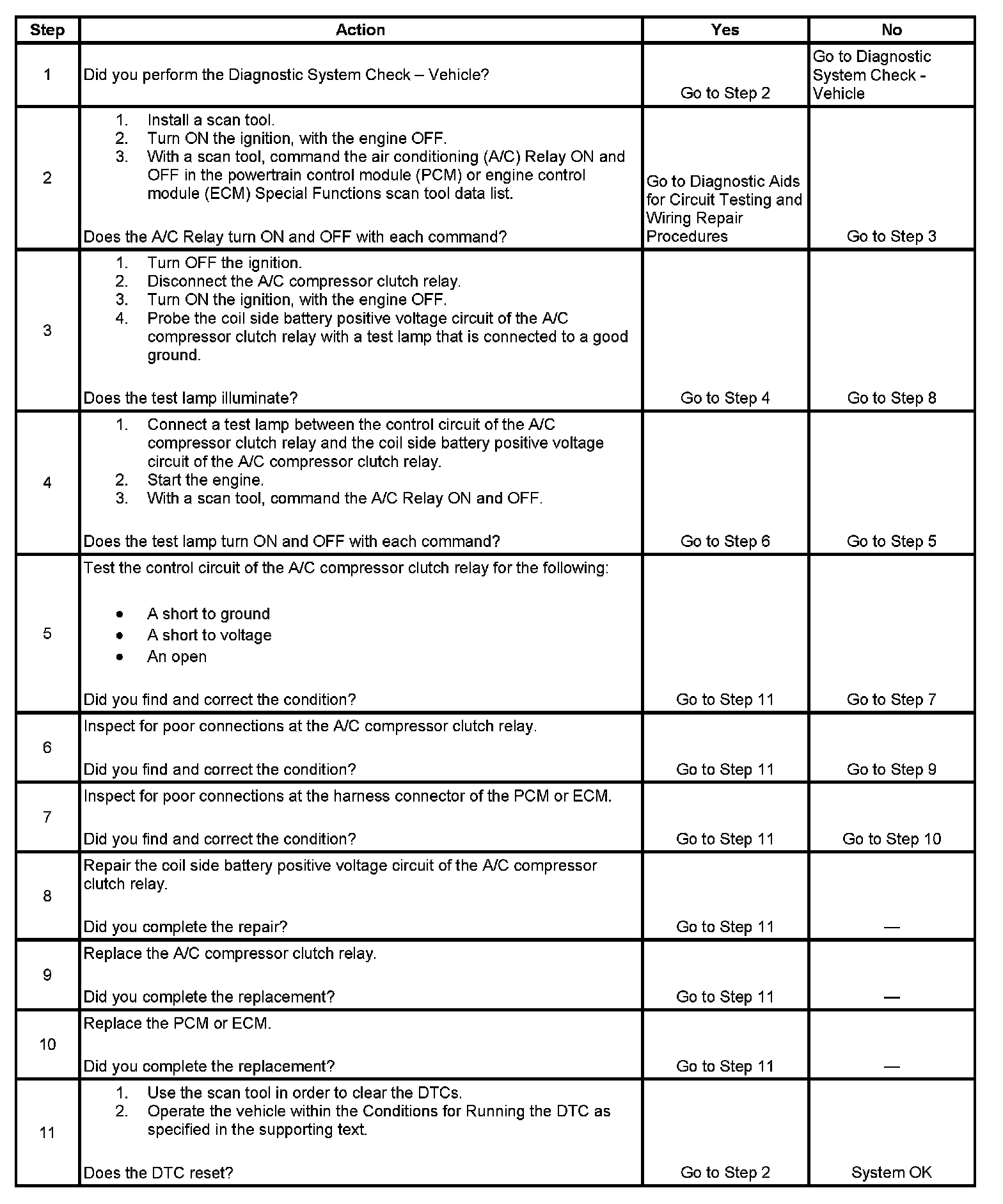 Ignition voltage is supplied directly to the air conditioning (A/C) compressor clutch relay. The powertrain control module (PCM) or engine control module (ECM) controls the relay by grounding the A/C clutch relay control circuit via an internal solid state device called a driver. The primary function of the driver is to supply the ground for the component being controlled. The driver has a fault line which is monitored by the PCM or ECM. When the PCM or ECM is commanding a component ON, the voltage of the control circuit should be near 0 volts. When the PCM or ECM is commanding the control circuit to a component OFF, the voltage potential of the circuit should be near battery voltage. If the fault detection circuit senses a voltage other than what is expected, this DTC will set.