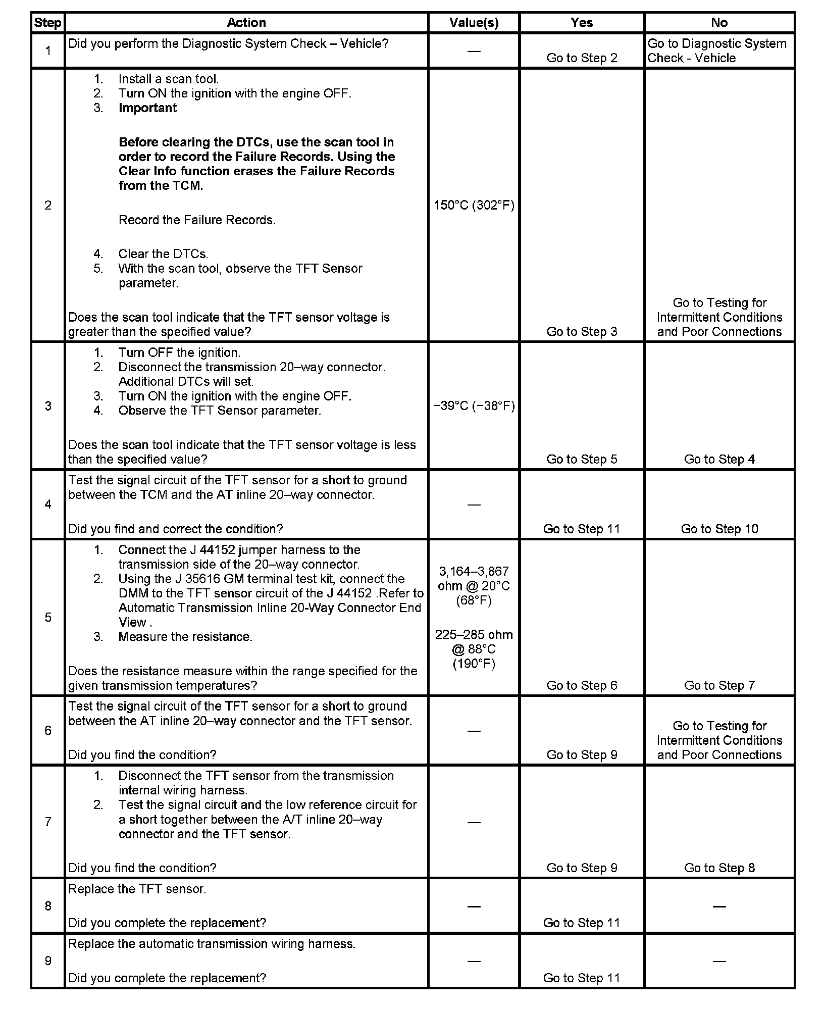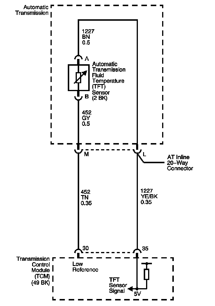 The automatic transmission fluid temperature (TFT) sensor is a negative coefficient thermistor whose resistance value changes based on temperature. The TCM provides a 5 volt reference to the sensor circuit. A high fluid temperature or a short to ground on the signal circuit results in low signal voltage. The TFT sensor operating range is -40 to +151°C (-40 to +304°F).