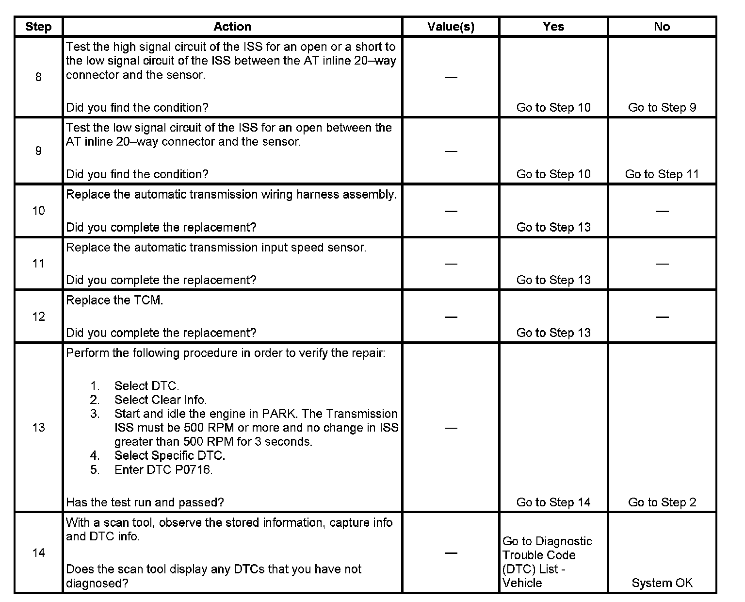 If the TCM detects an unrealistically large change in the ISS high signal in a short period of time, then DTC P0716 sets. DTC P0716 is a type B DTC.