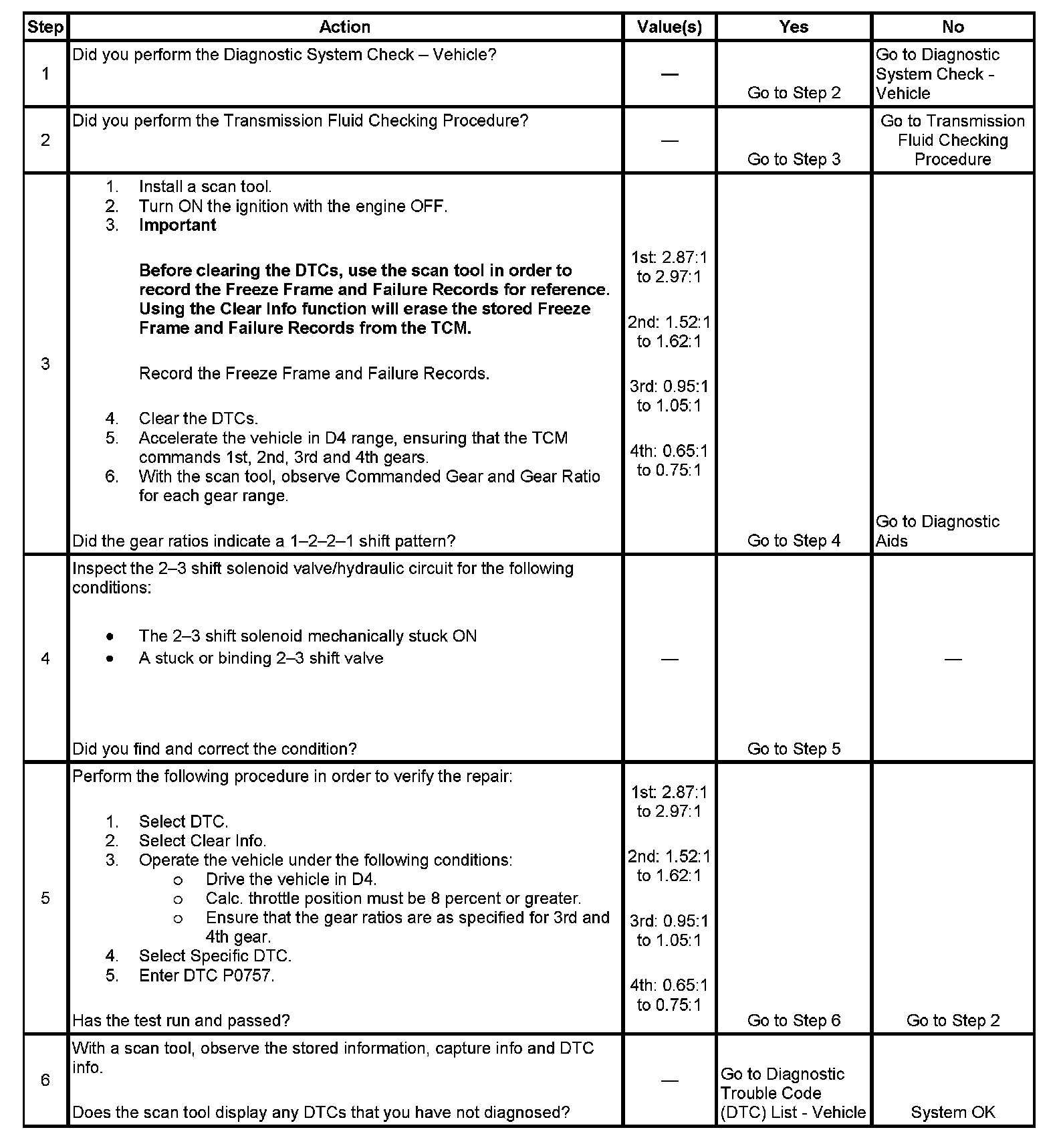 If the TCM detects a 2nd gear ratio when 3rd gear is commanded and a 1st gear ratio when 4th gear is commanded, then DTC P0757 sets. DTC P0757 is a type A DTC.
