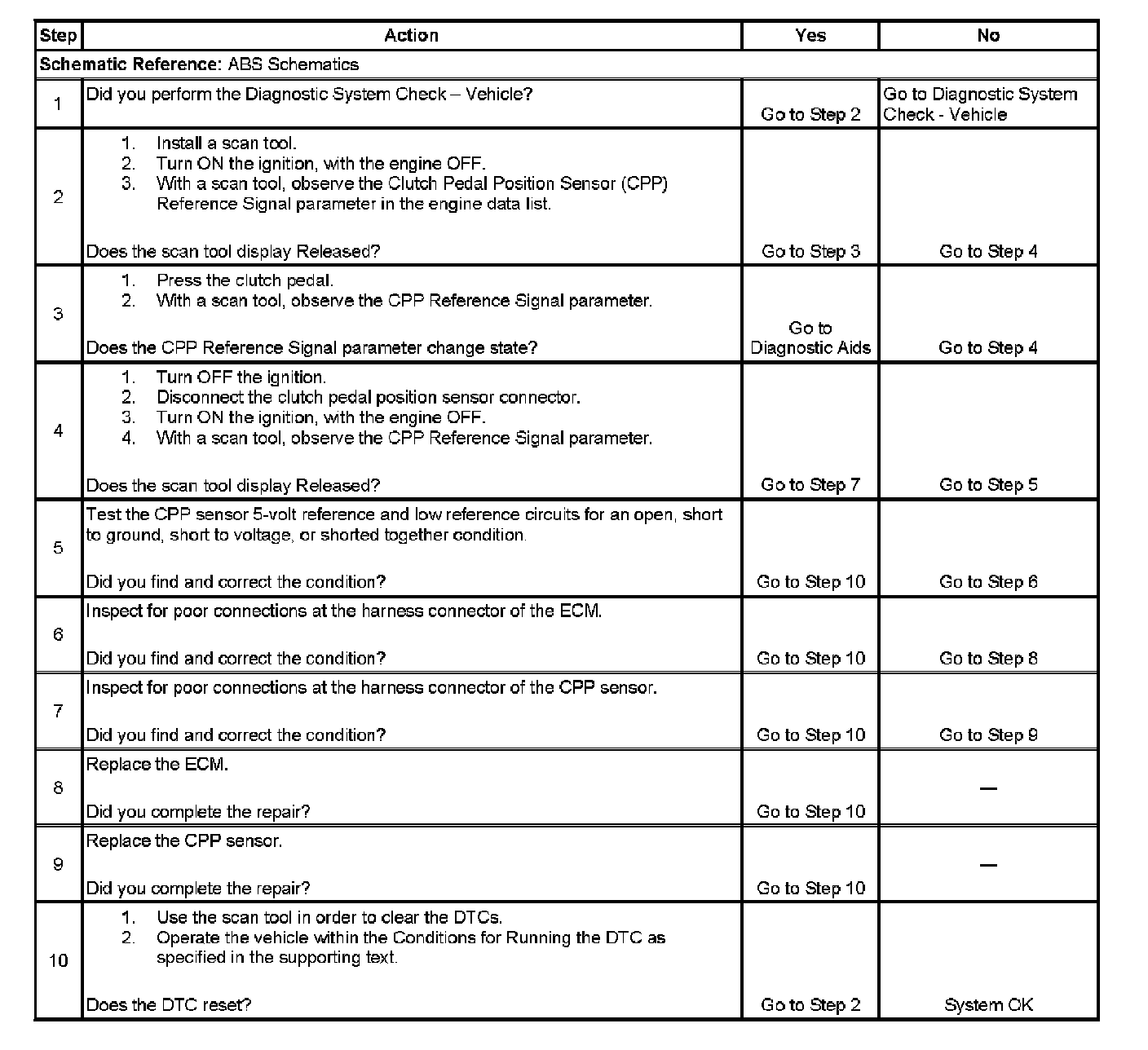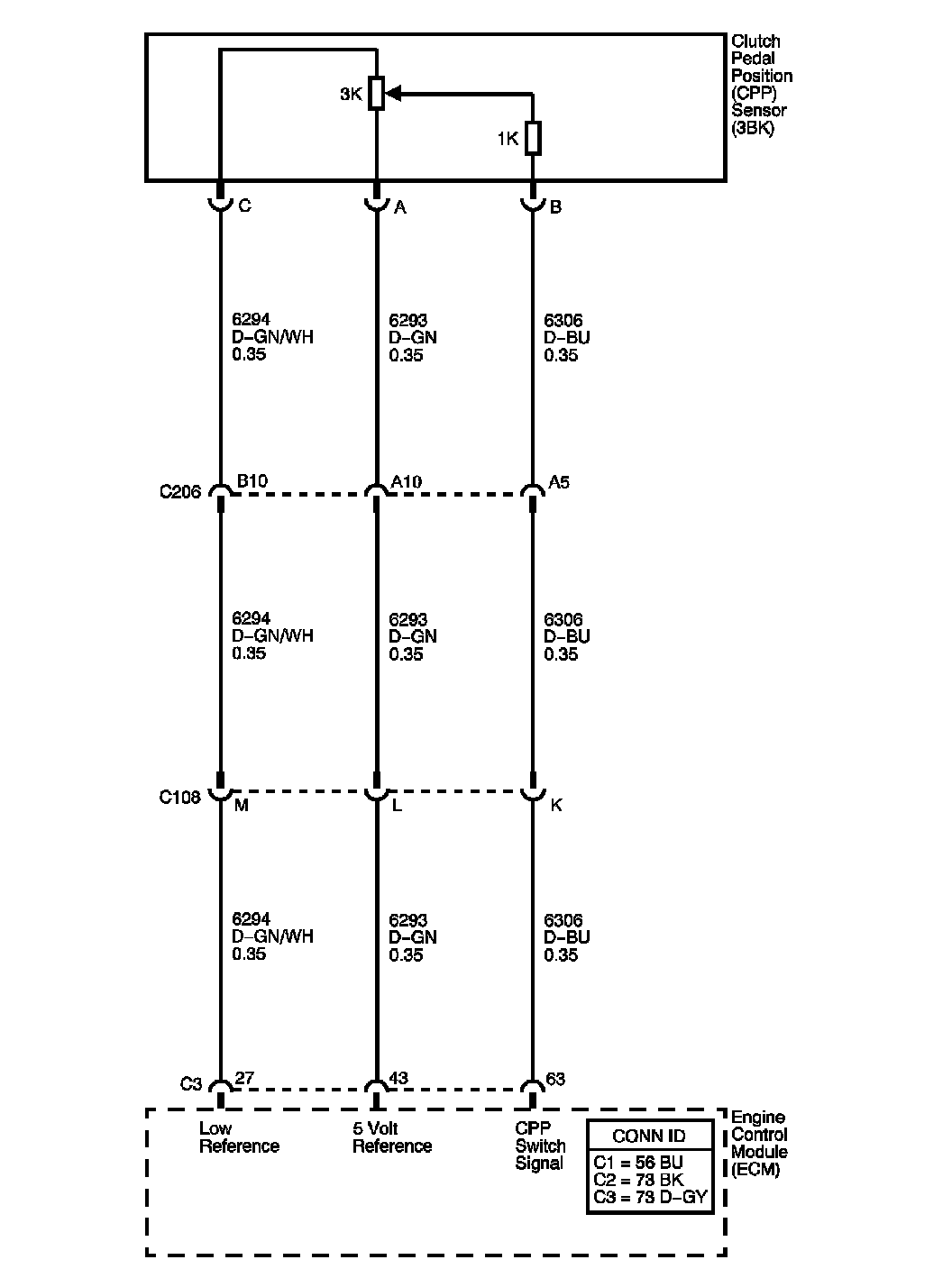 The clutch pedal position (CPP) sensor is an input to the engine control module (ECM). The CPP sensor is a potentiometer type sensor with a 5-volt reference circuit, a common low reference circuit and an independent signal circuit. The ECM supplies the 5-volt reference to the CPP.