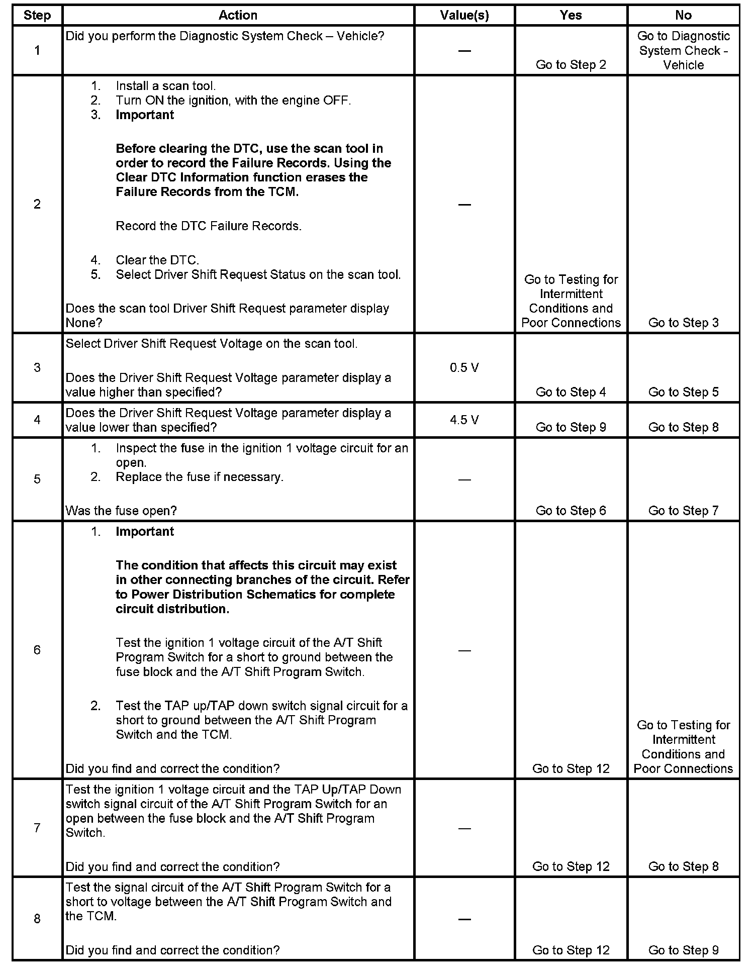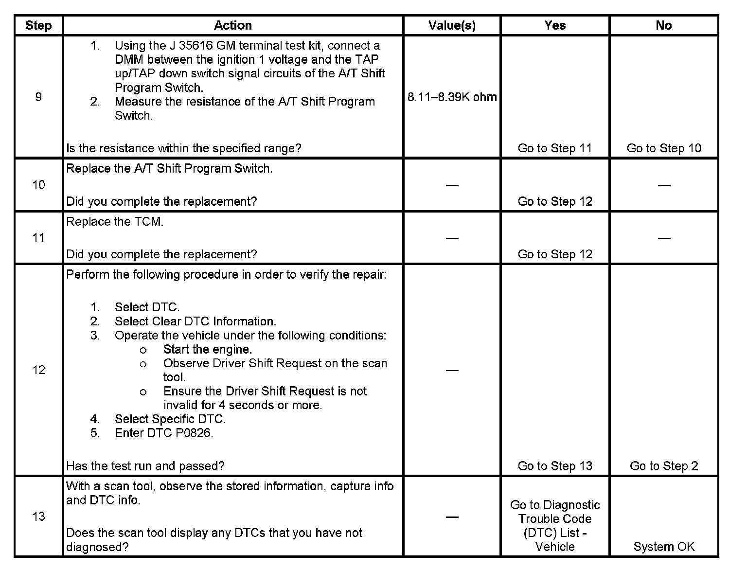 If the transmission control module (TCM) detects an invalid voltage on the TAP up/TAP down switch signal circuit, then DTC P0826 sets. DTC P0826 is a type C DTC.