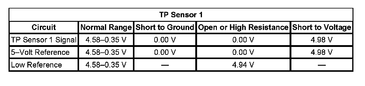 - If the voltage is less than 4.8 volts, test the TP sensor 1 signal circuit for an open, a short to ground, or a faulty ECM.