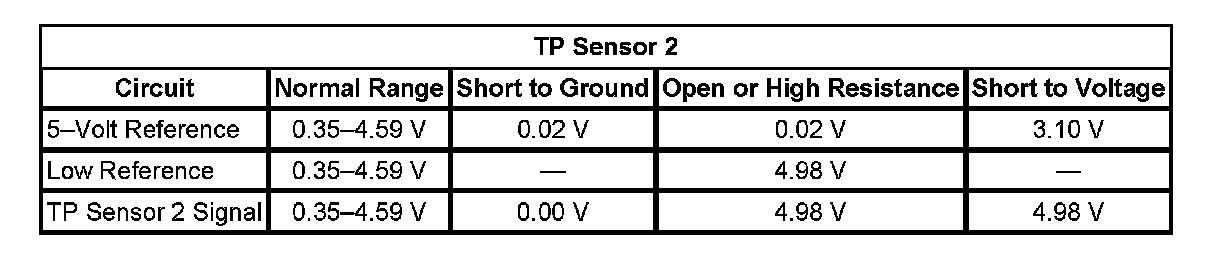 - If the voltage is less than 4.8 volts, test the TP sensor 2 signal circuit for a short to ground or a faulty ECM.