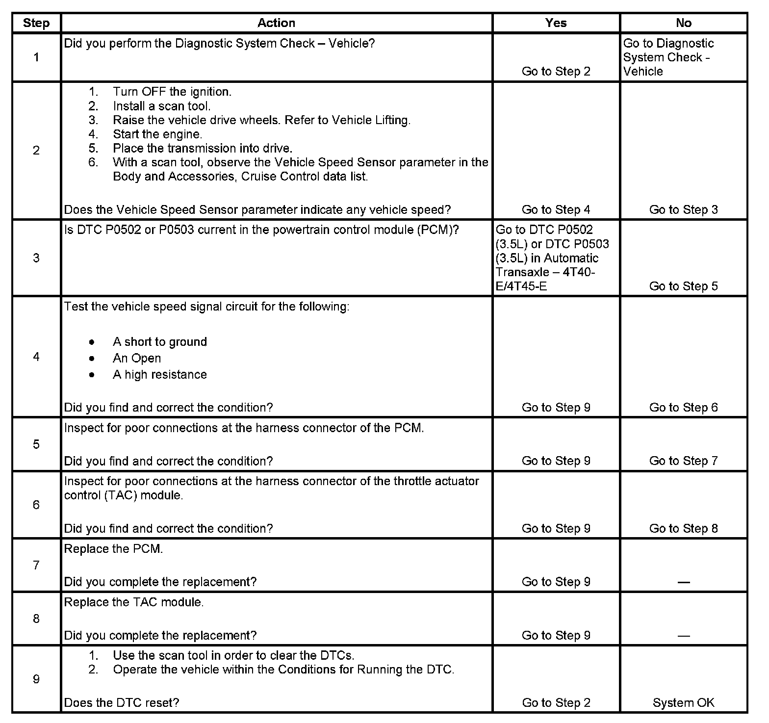 The vehicle speed signal circuit is an input to the throttle actuator control (TAC) module from the powertrain control module (PCM). The PCM provides a constant voltage signal on the vehicle speed signal circuit. The PCM creates the vehicle speed signal by internally pulsing the vehicle speed signal to ground. The TAC module uses the vehicle speed signal from the PCM, in order to determine the vehicle speed. The TAC module then sends a universal asynchronous receiver transmitter (UART) serial data message to the PCM indicating the vehicle speed that the TAC module has detected.