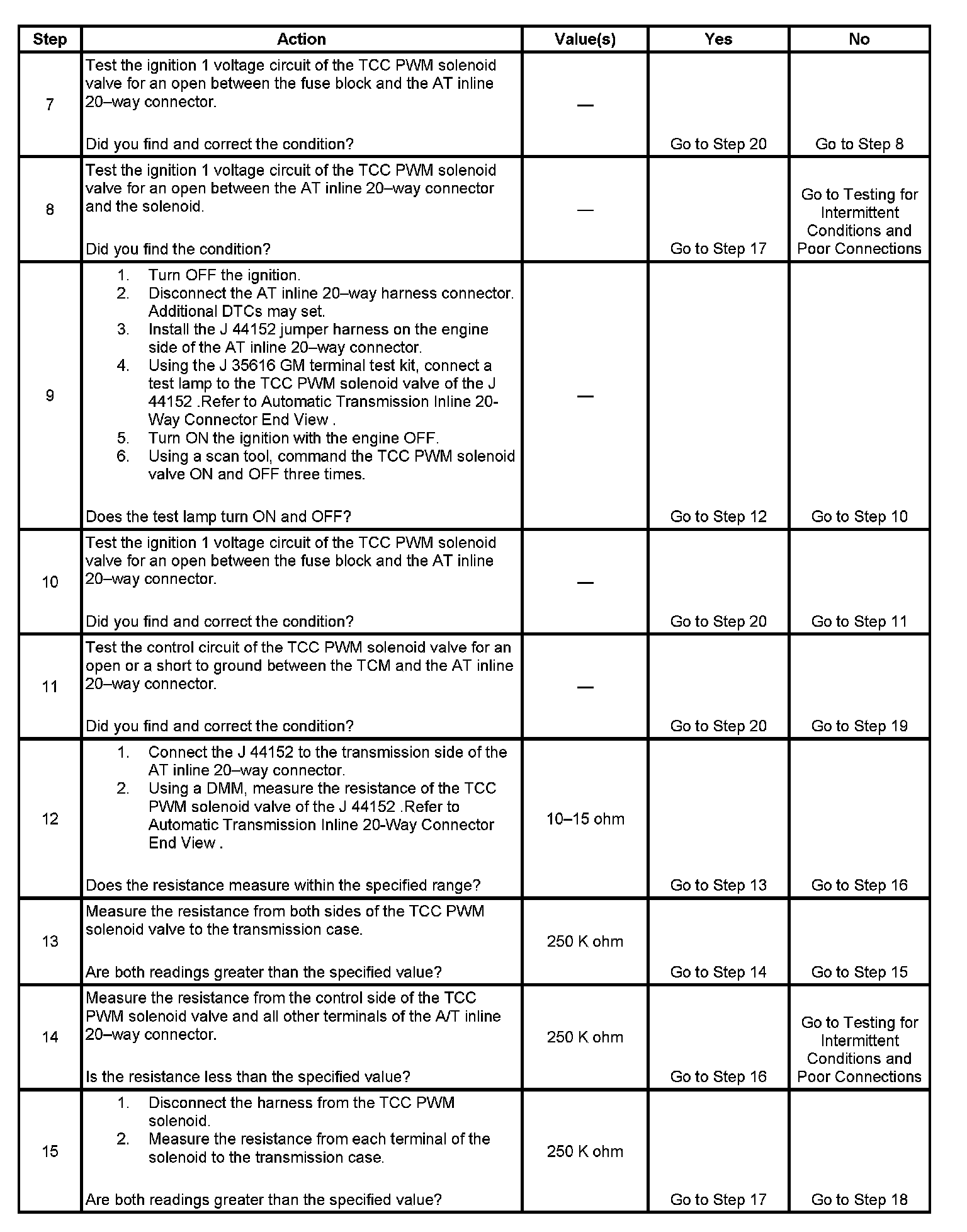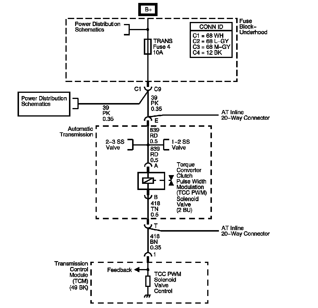 Ignition voltage is provided to the torque converter clutch pulse width modulation (TCC PWM) solenoid valve. The transmission control module (TCM) controls the solenoid with a negative duty cycle in order to control application and release of the TCC. When the solenoid is commanded OFF, the TCM senses high voltage. When the solenoid is commanded ON, the TCM senses low voltage.