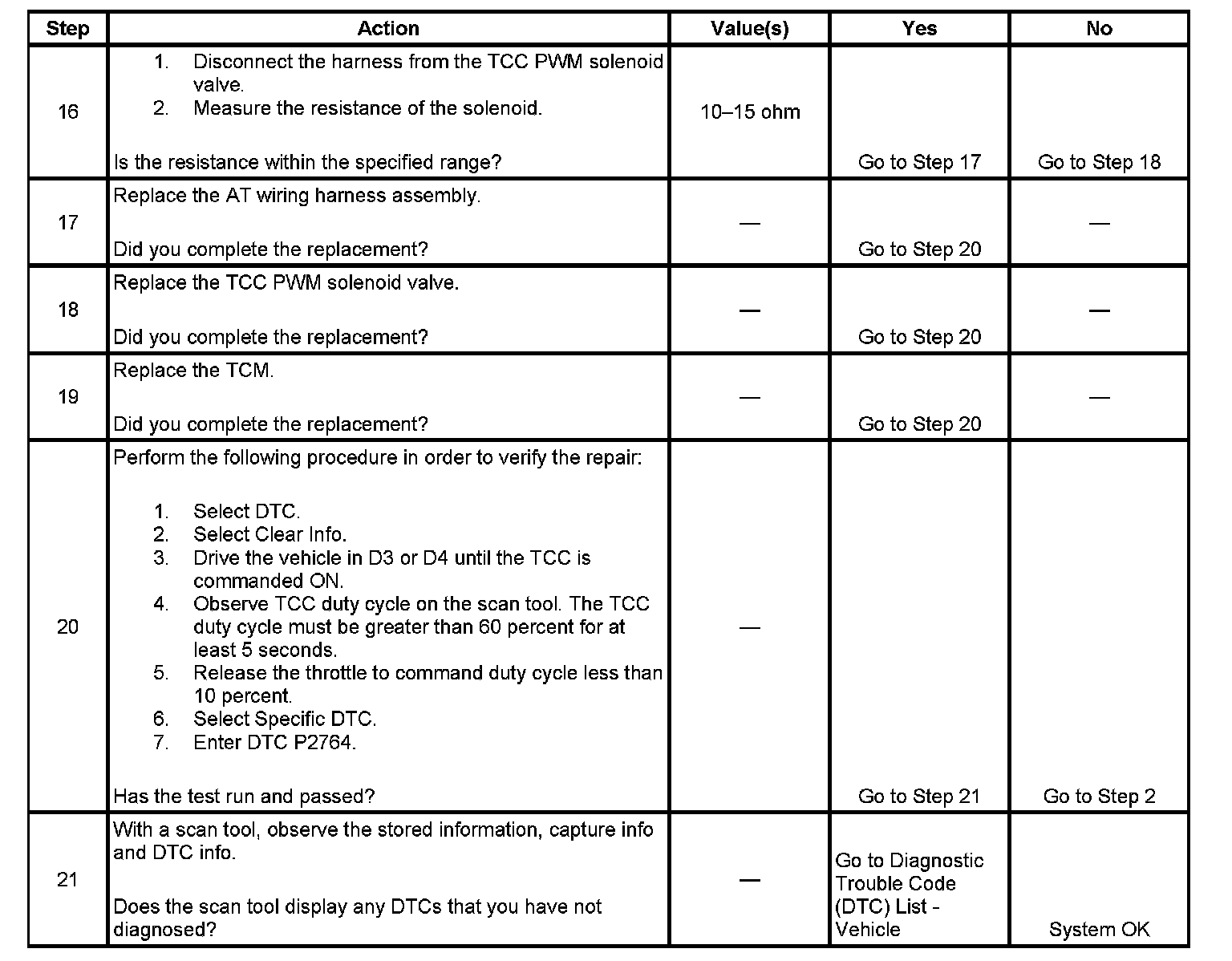 DTC P2764 sets if the TCM detects an open or short to ground on the TCC PWM solenoid valve control circuit. DTC P2764 is a type B DTC.