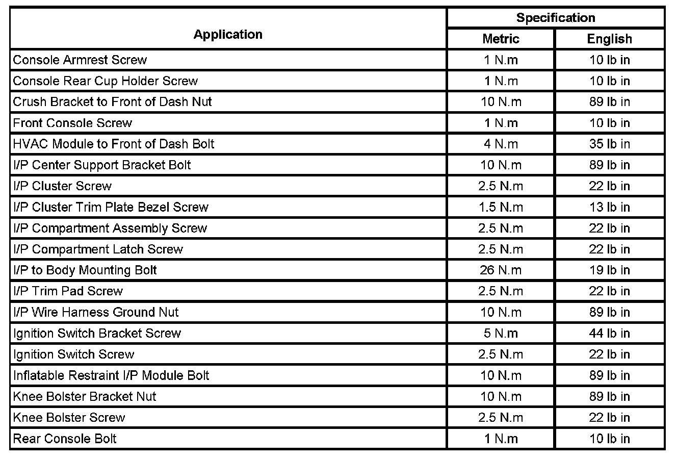 Instrument Panel, Gages, and Console - Fastener Tightening Specifications