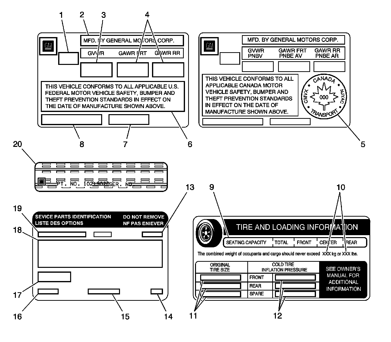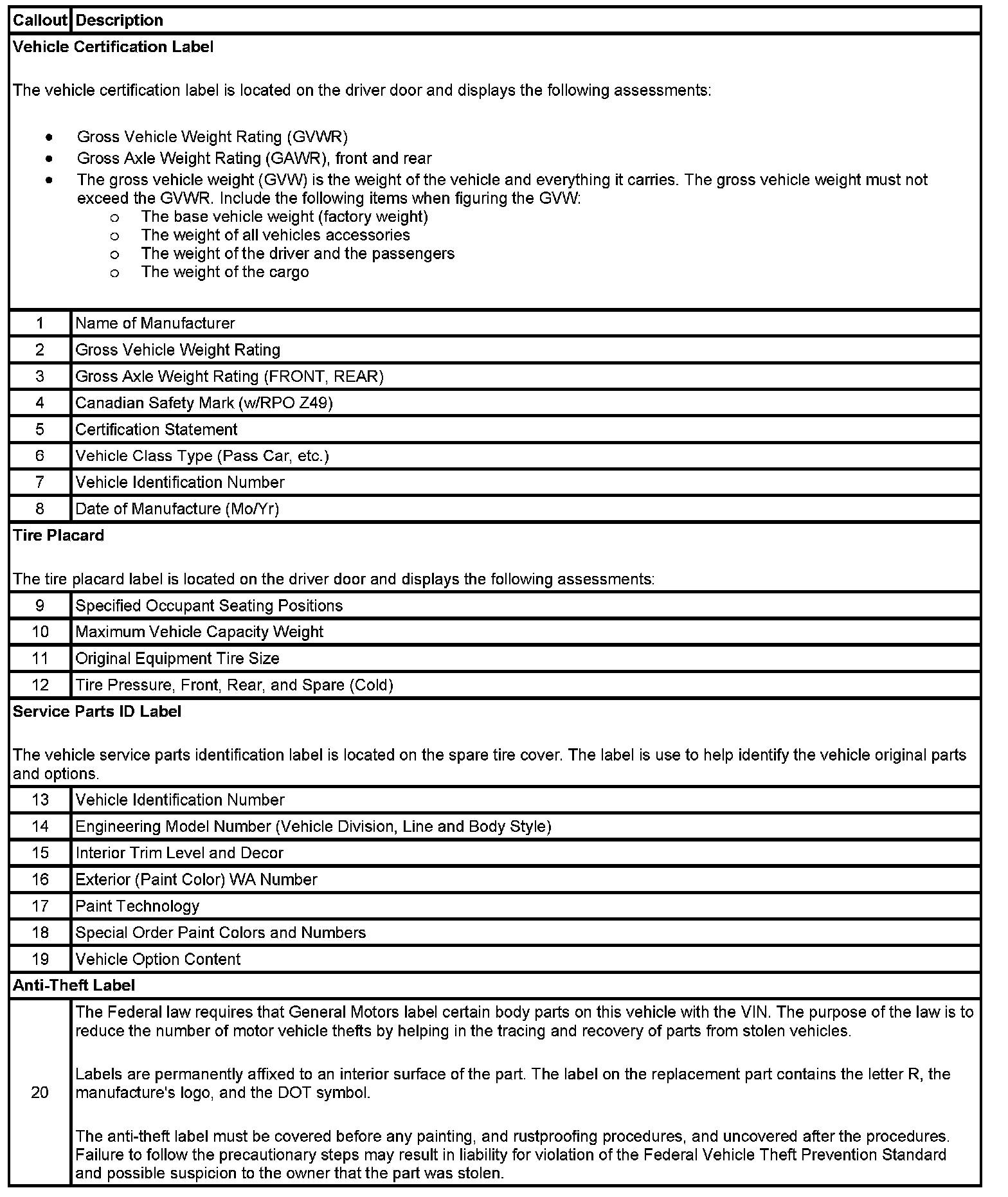 Label - Vehicle Certification, Tire Place Card, Anti-Theft and Service Parts ID: