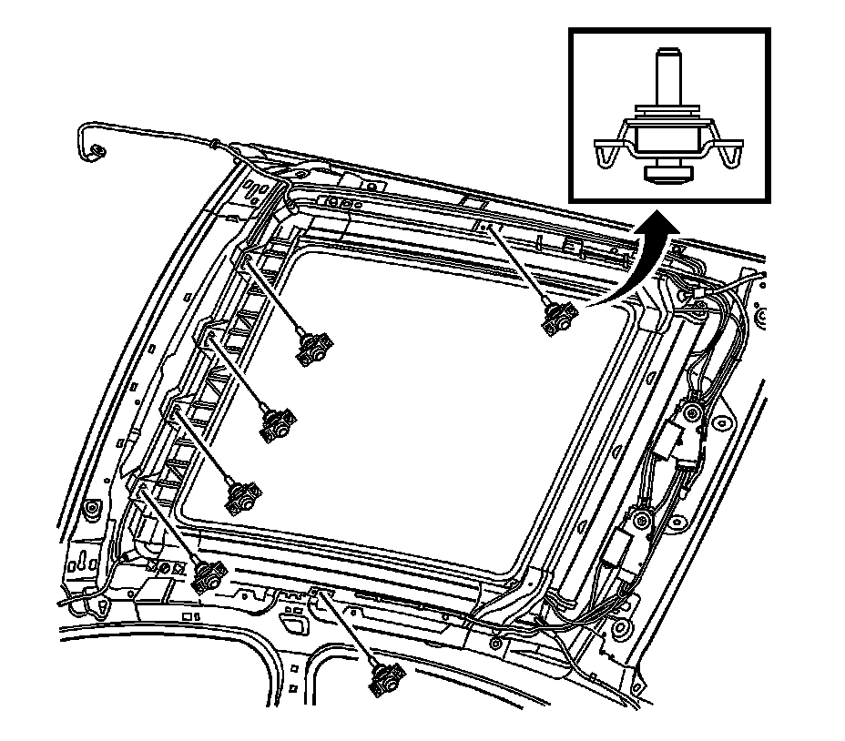 13. If the sunroof window seal appears low along the front, adjust the four fasteners/tolerance compensators along the front. Refer to Sunroof Module Assembly Replacement (CF5) Sunroof Module Assembly Replacement (C3Y).