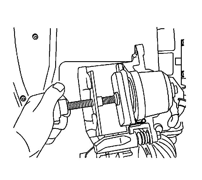 Notice: Support the brake caliper with heavy mechanic's wire, or equivalent, whenever it is separated from its mount and the hydraulic flexible brake hose is still connected. Failure to support the caliper in this manner will cause the flexible brake hose to bear the weight of the caliper, which may cause damage to the brake hose and in turn may cause a brake fluid leak.