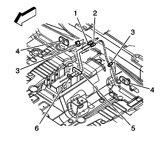 4. Remove the right rear park brake cable (1) or the left rear park brake cable (2) from the console park brake bracket (5) and the front park brake cable equalizer (6).