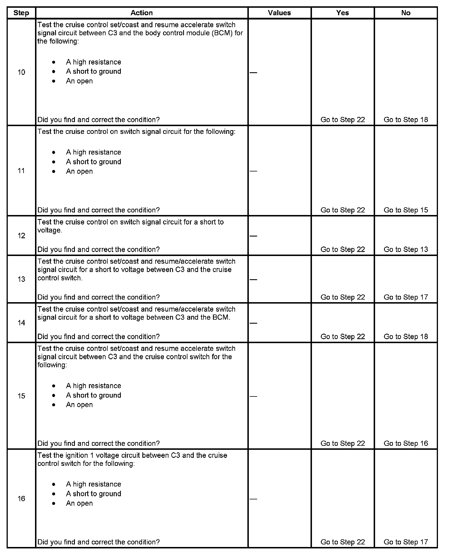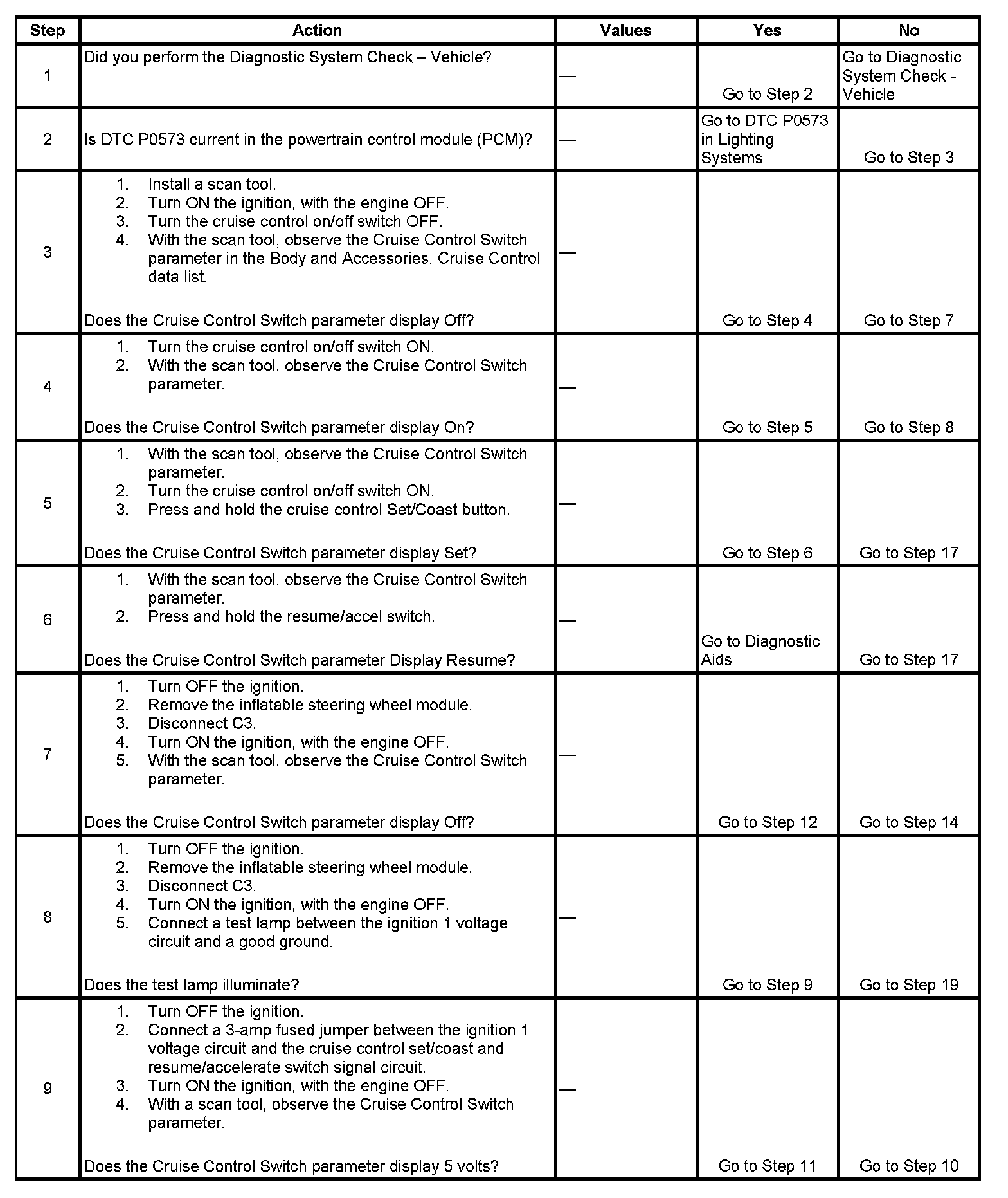 - Rotate the steering wheel to both steering stops and activate each cruise control switch separately. With a scan tool, observe the Cruise Control Switch parameter in the Body and Accessories, Cruise Control data list. This will help eliminate the possibility of a internally open or shorted inflatable restraint steering wheel module coil.
