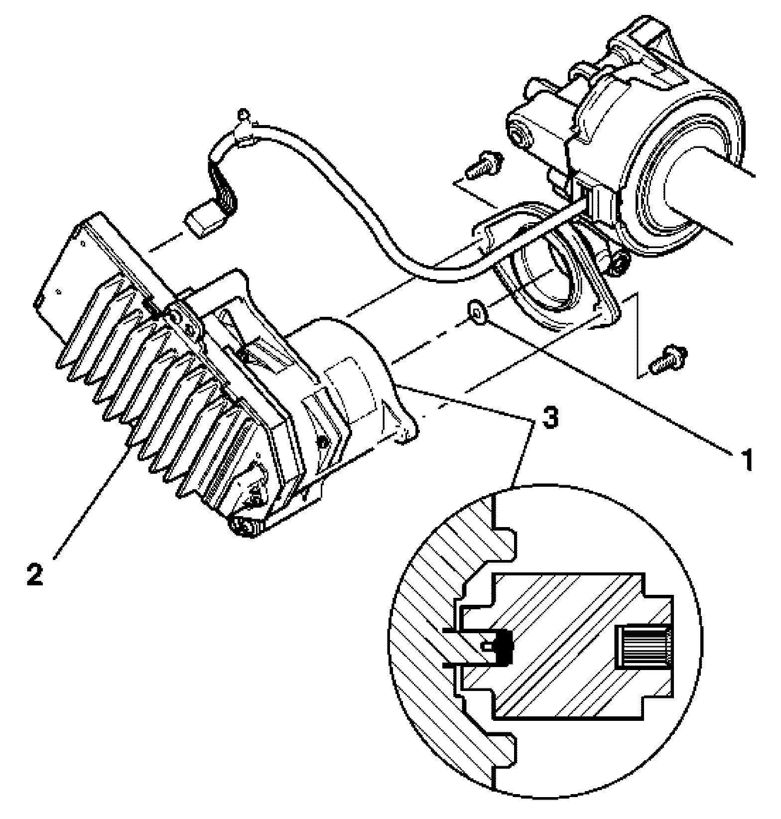 1. Insert the rotor isolator bumper (1) into the rotor isolator (3) in the power steering assist motor (2).