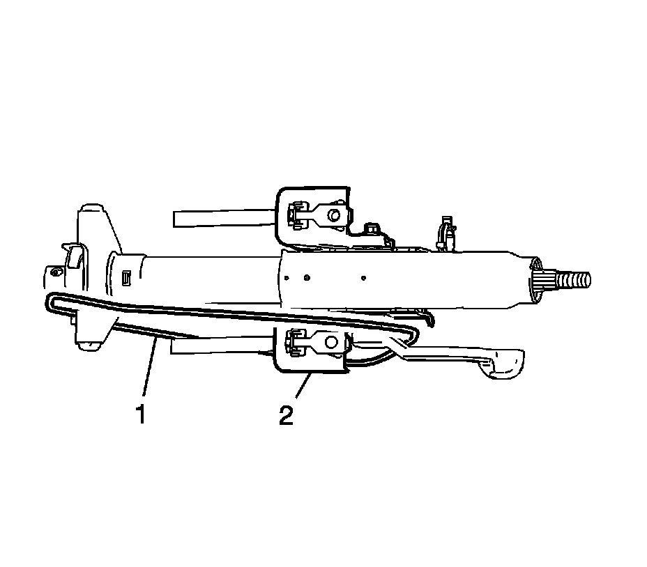 7. Important: Install tie straps (1) between the rake bracket assembly (2) and the base of the steering column to prevent jacket assembly pull-apart. The steering column rake lever MUST be in the LOCK (FULL UP) position during steering column removal and installation to ensure that the rake lever bracket remains rigid. Install a tie strap around the lever and the jacket assembly to keep the lever in the LOCK position. Do not bend the steering column energy absorbing straps located on the upper steering column mounting bracket.