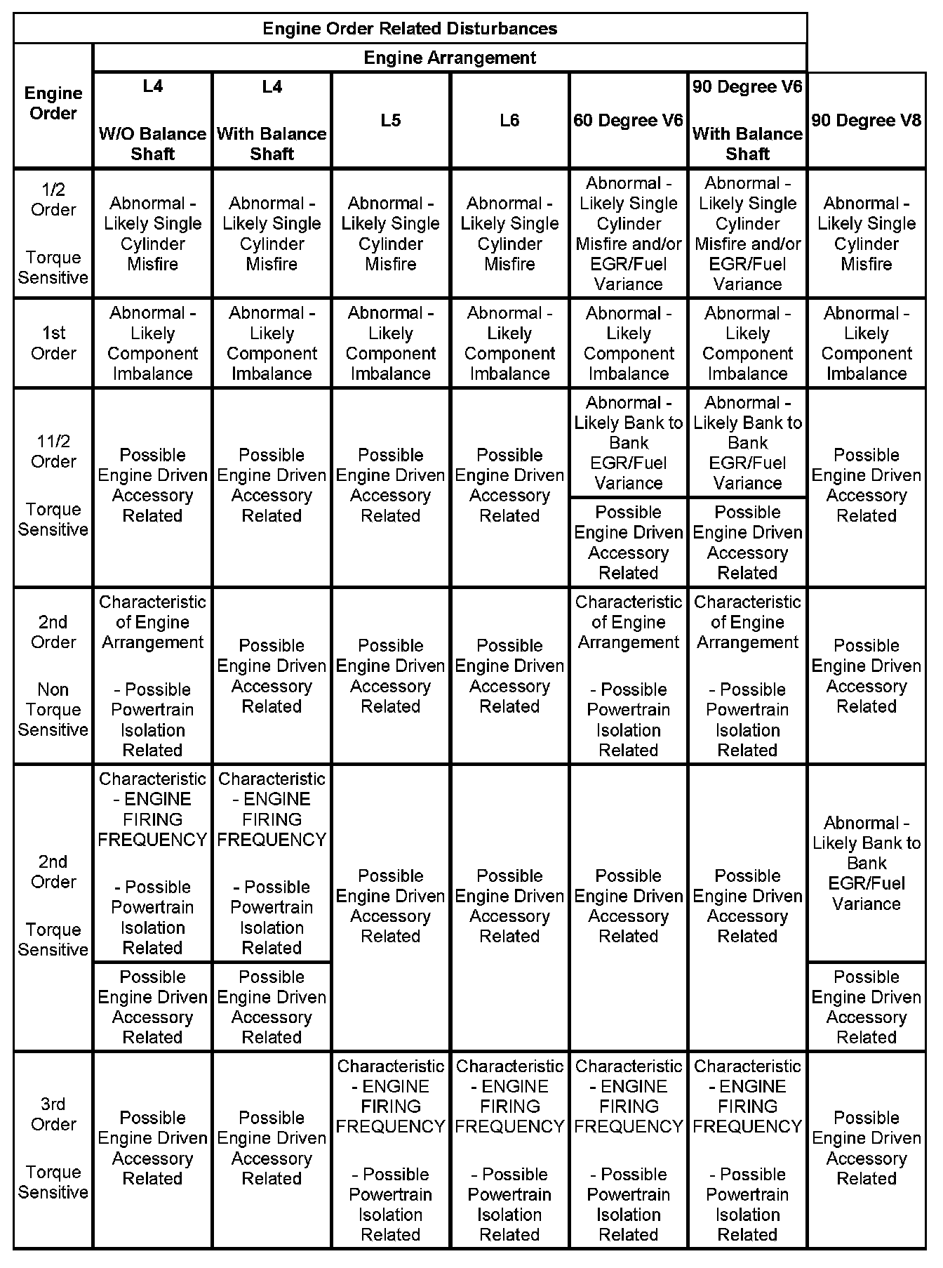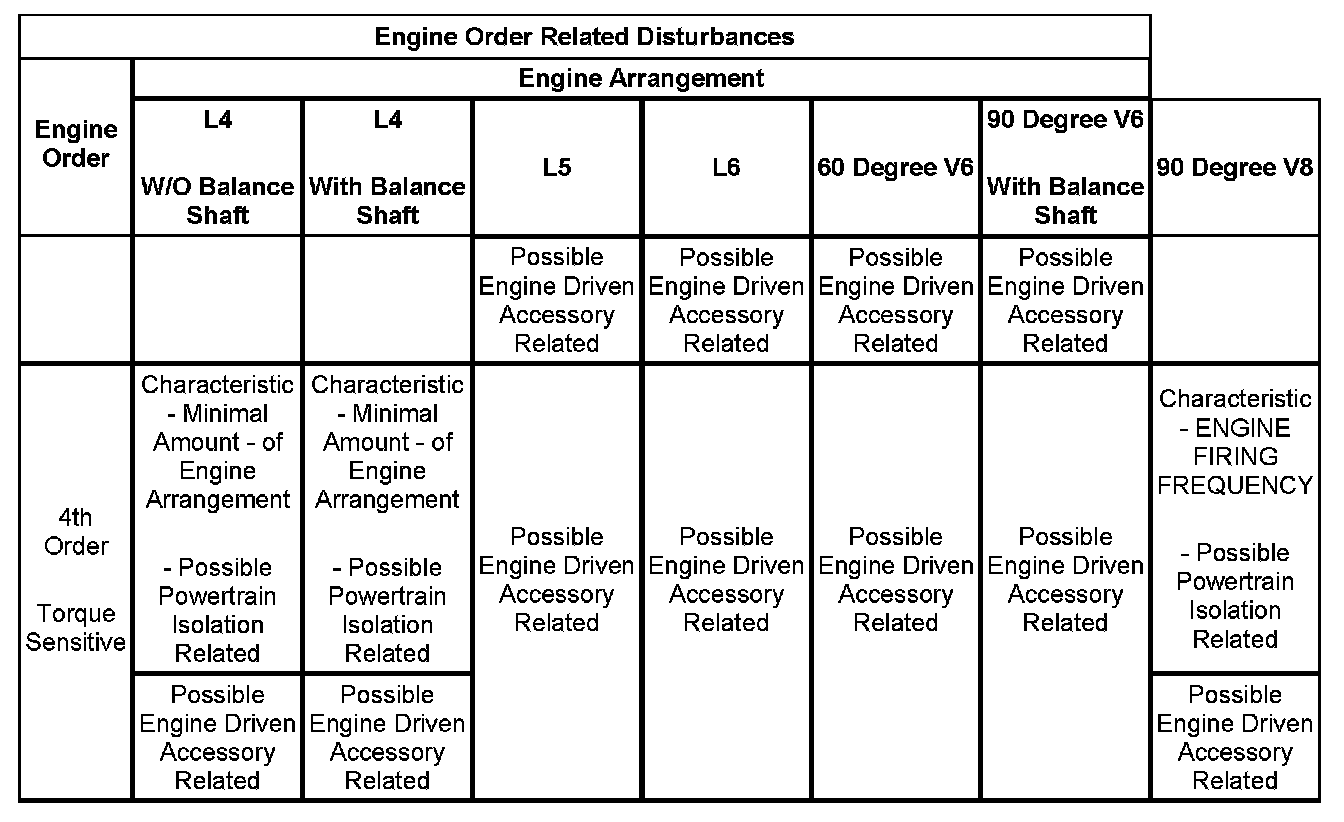 3. If the dominant frequency in Hz, recorded during duplication of the disturbance and the engine firing frequency in Hz, just calculated ARE related, then an engine FIRING FREQUENCY related disturbance is present. Engine firing frequency disturbances are usually related to improper isolation of a component. Refer to the Engine Order Related Disturbances table.