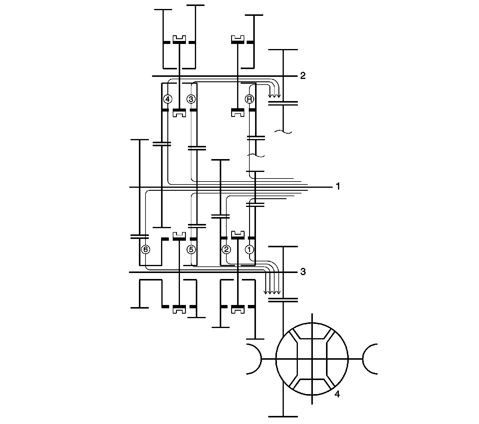 The input shaft (1), upper output shaft (2), lower output shaft (3) and differential (4) are shown in the illustration.
